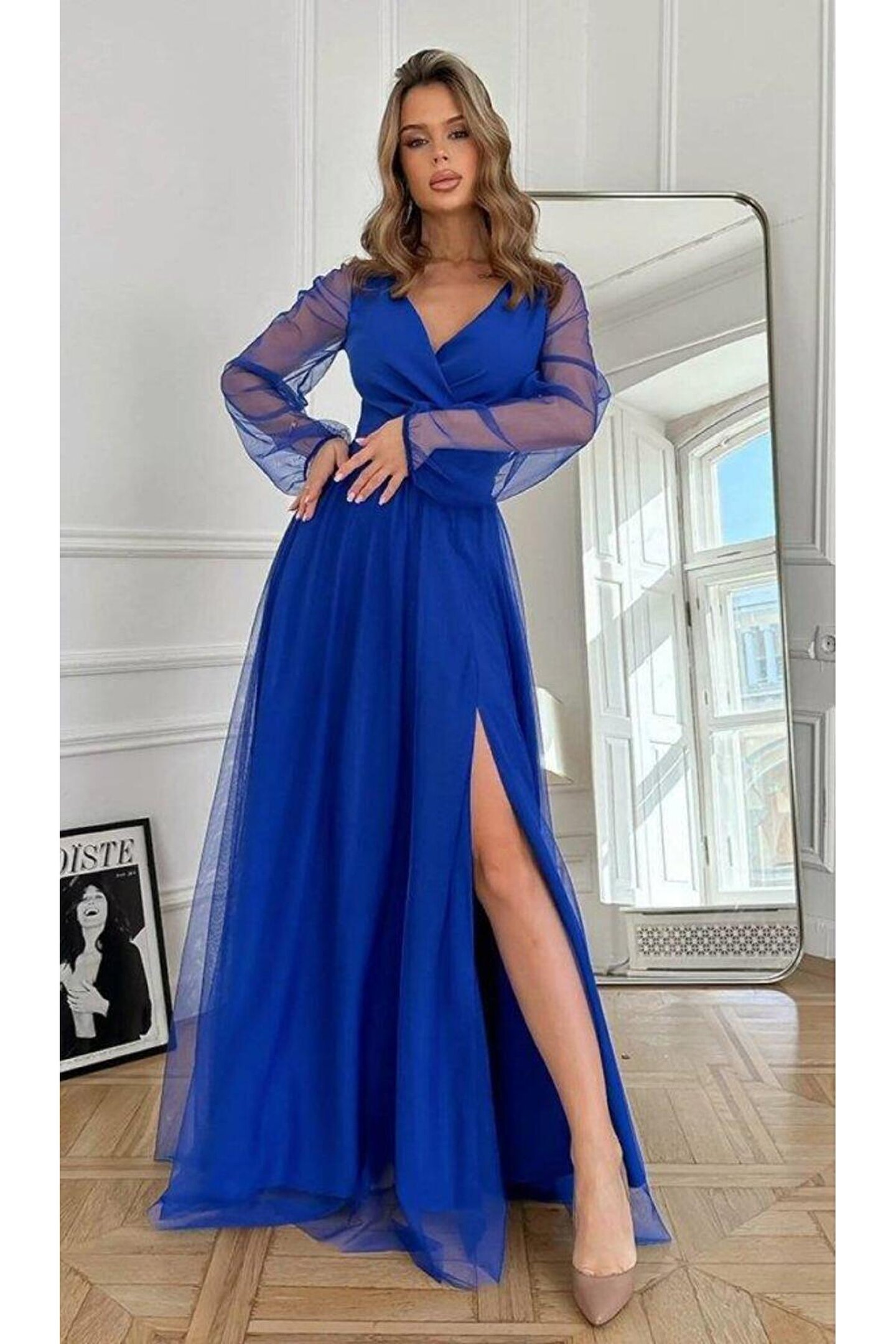 babatr.com MDB Kadın Uzun Kollu Kruvaze Yakalı Belden Kuşaklı Tüllü Uzun Ithal Krep Elbise