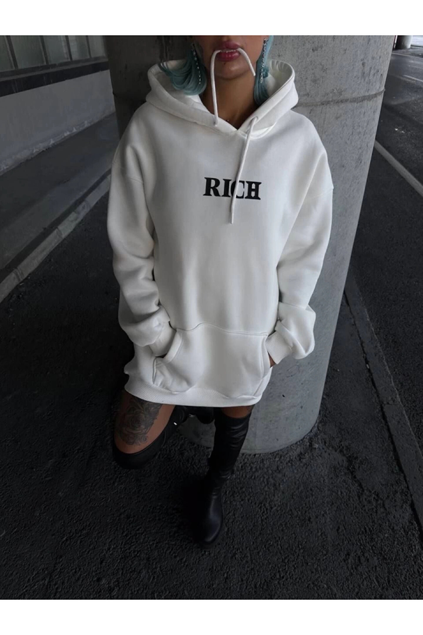 Uzun Kol Kapşonlu Göğüs Baskılı SweatShirt - Beyaz