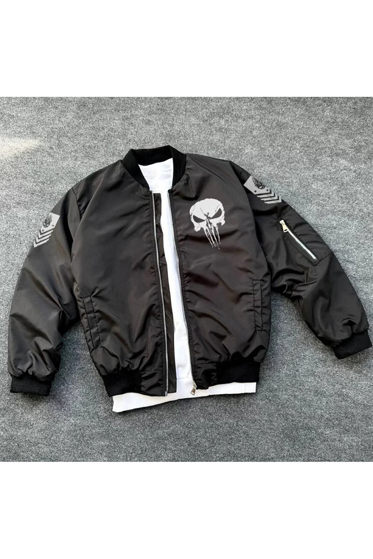 Unisex Uzun Kol Kuru Kafa Baskılı Bomber Ceket - Siyah