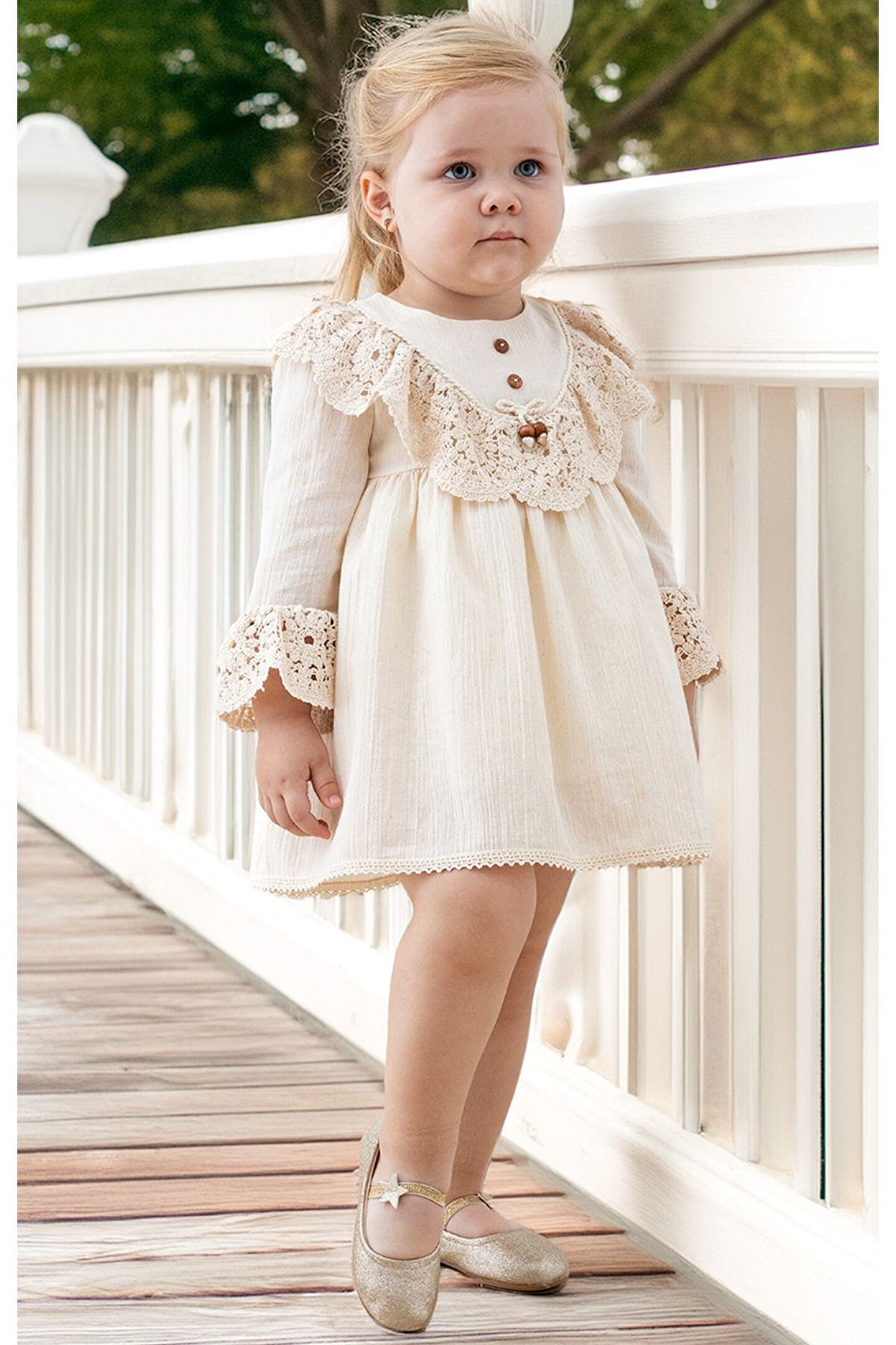 Kız Bebek Elbise Kız Çocuk Elbise Doğum Günü Parti Düğün Keten Uzun Kollu Astarlı Elbise