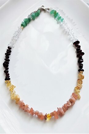 Doğal taşların eşsiz güzelliğini yansıtan bu kolye, kehribar, güneş taşı, sitrin, lal ve kristal kuvars gibi farklı renklerdeki taşlarla tasarlanmıştır; Her bir taşı özenle seçilmiş ve bir araya getirilerek, doğanın saf enerjisini boynunuzda taşıyabileceğiniz bir aksesuar oluşturulmuştur; Bu kolye, hem günlük kullanım hem de özel günler için ideal bir aksesuar olarak dikkat çeker; şıklığınızı tamamlayacak zarif bir dokunuş sunar; Doğal taşların benzersiz desenleri ve renkleriyle öne çıkan bu kolye, her kıyafetle uyum sağlayarak stilinizi yansıtmanızı sağlar;