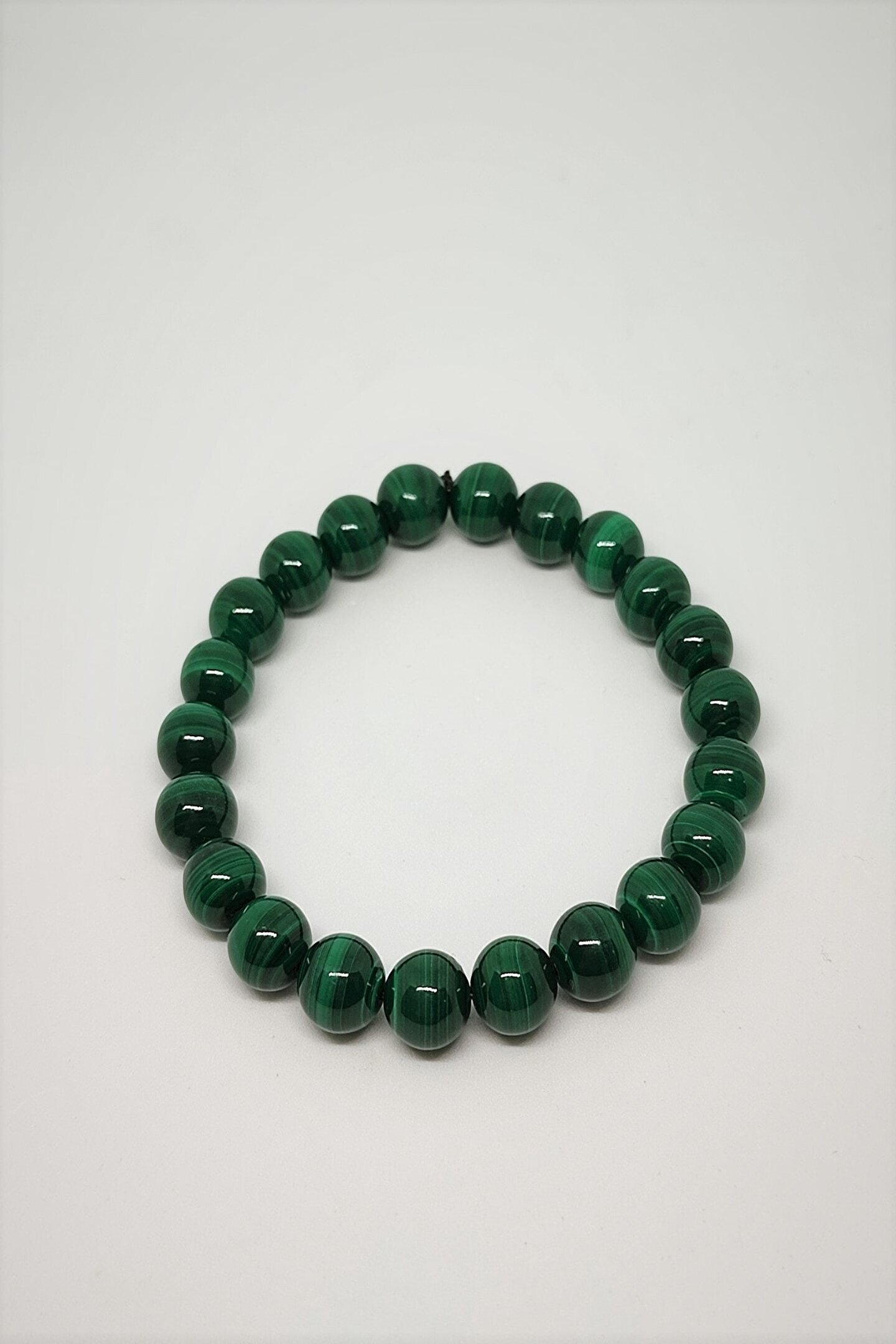 Doğal malahit taşı kullanılarak üretilmiş, şıklığı ve doğallığı bir arada sunan bileklik; Sertifikalı malahit taşı ile kalite ve güvenilirlik garantisi; 8 mm boyutundaki taşlar, zarif ve modern bir görünüm sağlar; Her bilek boyutuna uyum sağlayacak esnek tasarım;
