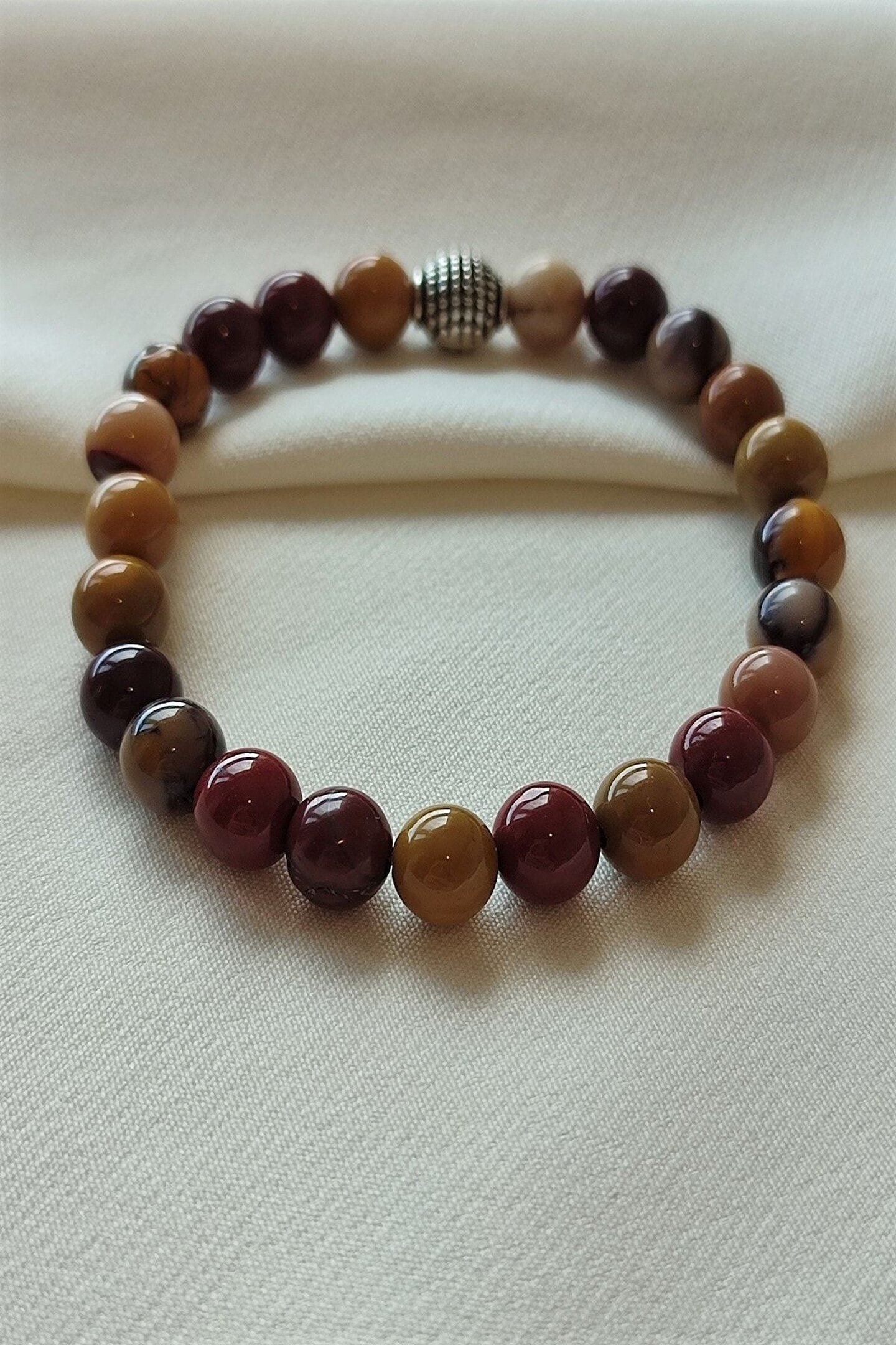 Doğal taş kullanımı, her bir bilekliğin benzersiz ve otantik bir görünüm kazanmasını sağlar; Sertifikalı 8 mm mokait jasper doğaltaş, bilekliğin dayanıklılığını ve uzun ömürlü kullanımını garanti eder; Doğal taş bileklik, hem şıklığı hem de doğallığı bir arada sunarak günlük kombinlerinizde fark yaratmanızı sağlar;