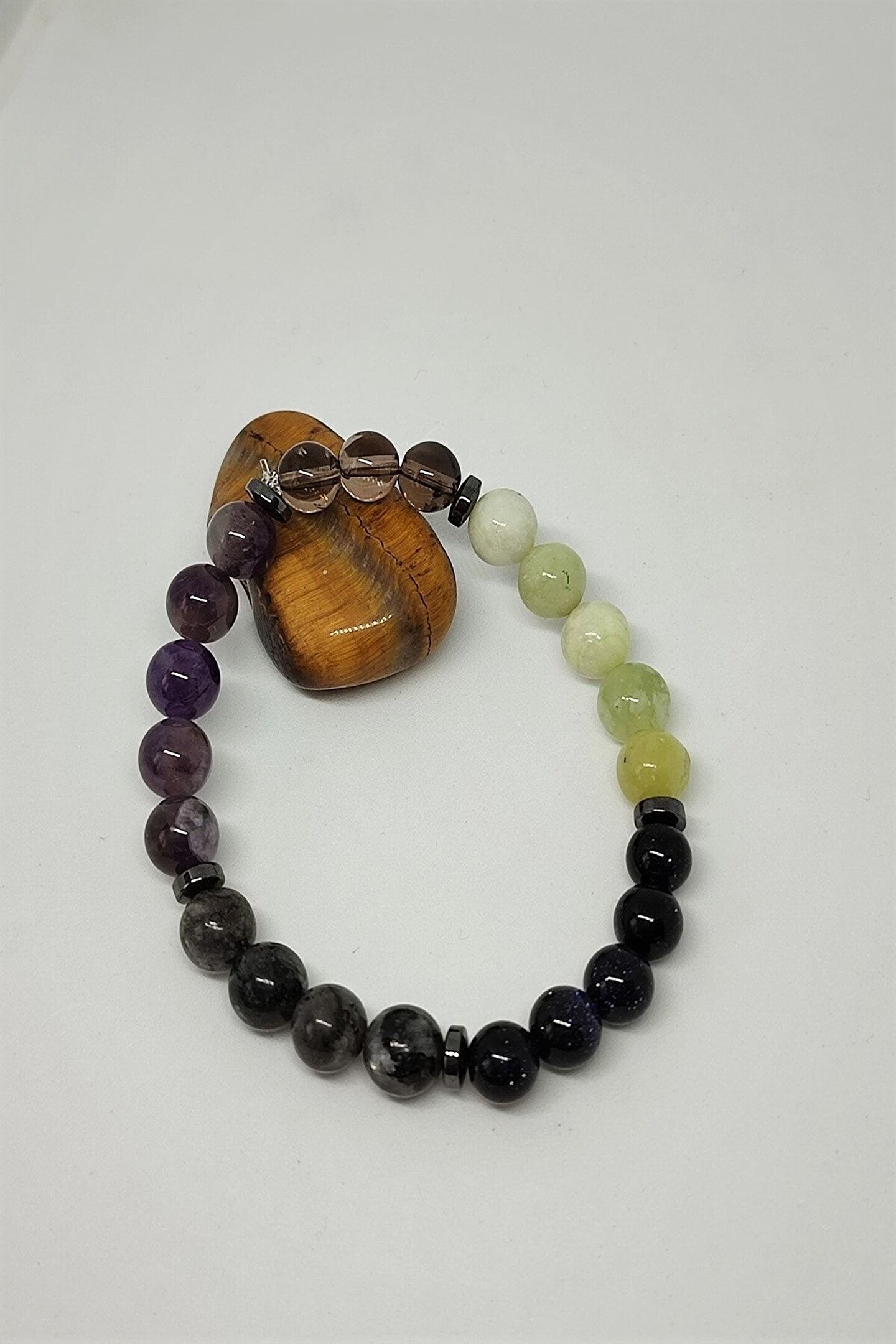 Doğal taş bileklik, her bir bileklikte bulunan farklı doğaltaşların enerjilerini bir araya getirerek benzersiz bir şıklık sunar; Duman kuvars, zebercet, yıldız taşı, labradorit ve ametist gibi sertifikalı taşlar, bilekliğin hem estetik hem de enerjik bir görünüm kazanmasını sağlar; Bu bileklik, Kova burcu bireylerinin karakteristik özelliklerini yansıtan bir aksesuar olarak tasarlanmıştır ve onların enerjilerini dengelemelerine yardımcı olabilir; Doğal taşların sunduğu sıcaklık ve zarafet, günlük kullanım için ideal bir aksesuar oluştururken, aynı zamanda kişisel stilinizi de ön plana çıkarır;