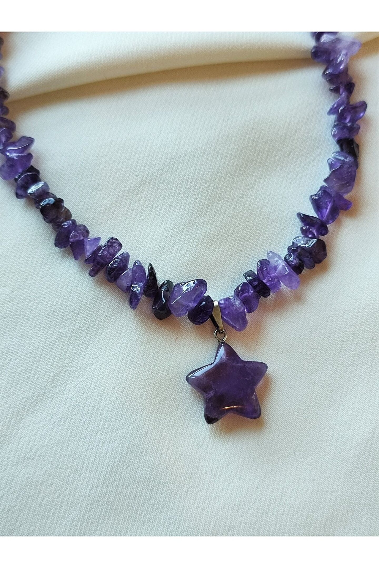- Doğal taş kullanımı sayesinde her kolye benzersiz ve otantik bir görünüm sunar; - Koyu ametist yıldız kırıktaş doğaltaş, şıklığı ve zarafeti bir arada barındırır; - Bijuteri kolye tasarımı, modern ve trend bir stil ifade ederken aynı zamanda geleneksel dokunuşları da yansıtır;
