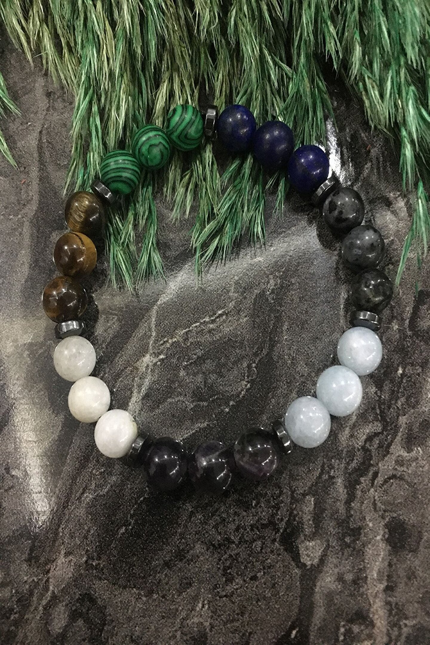 - Doğal taşların şıklığını ve gücünü bileğinizde hissedin: Malahit, ay taşı, ametist, akvaryum, labradorit ve akvaryum gibi sertifikalı doğaltaşlardan oluşan bu bileklik, her kıyafetle uyum sağlayacak zarif bir aksesuar sunar; - Her bir bileklik, benzersiz ve özgün bir tasarım anlayışıyla üretilmiştir; bu sayede her bir parça, kişisel tarzınıza özel bir dokunuş katar; - Doğal taşların enerjik özelliklerinden faydalanarak, günlük yaşamınızda pozitif bir etki yaratmanızı sağlar; - Hem günlük kullanım hem de özel günler için ideal olan bu bileklik, her ortamda dikkat çekici bir aksesuar olarak öne çıkar;