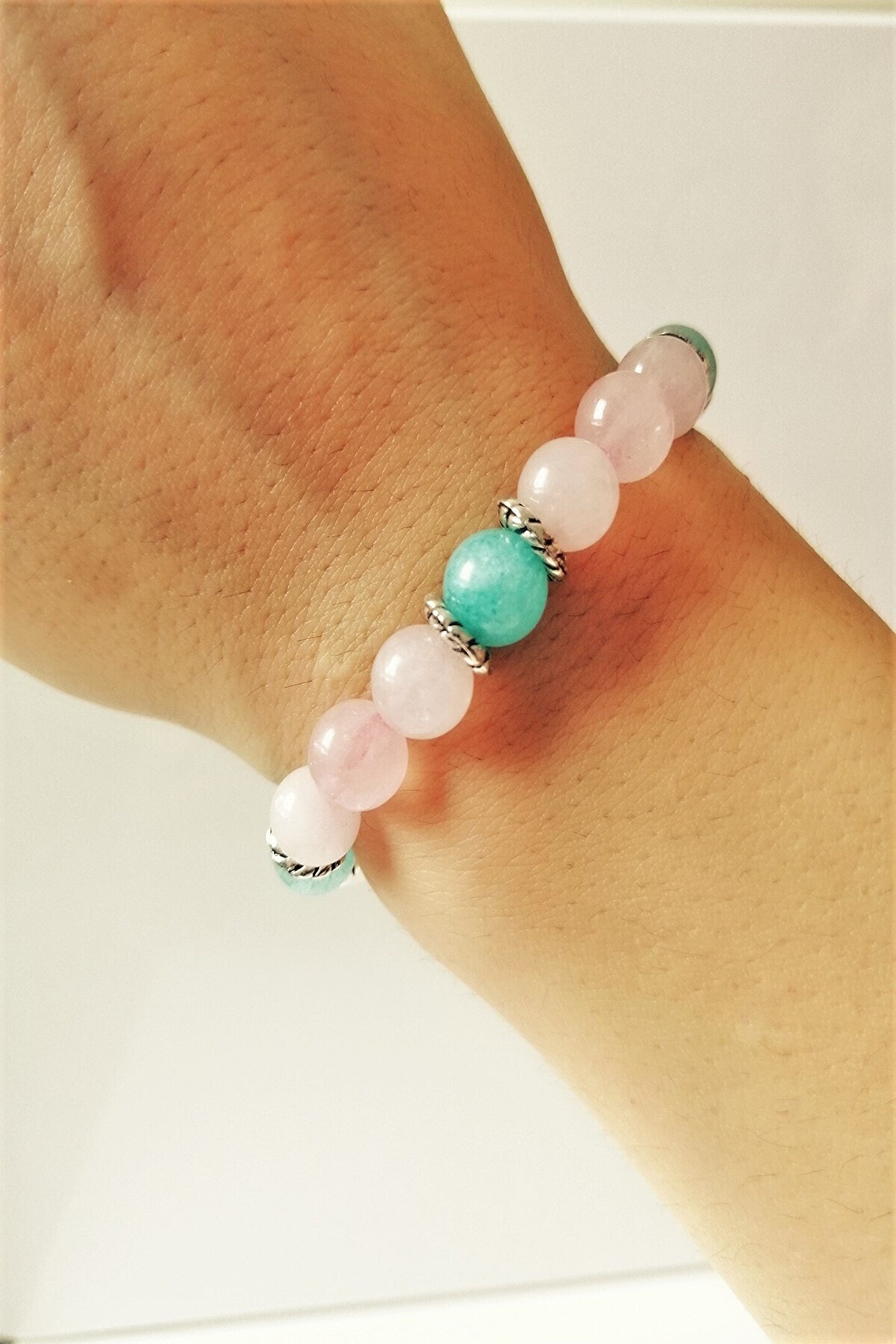 Doğal taş kullanımı sayesinde her bileklik benzersiz ve otantik bir görünüm sunar; Sertifikalı pembe kuvars ve mavi akik taşları, bilekliğe zarif bir parlaklık ve estetik bir dokunuş katar; Doğal taşların şık tasarımıyla günlük kullanım için idealdir; hem rahatlığı hem de stil sahibi görünümü bir arada sunar; Bileklik, hem kişisel kullanım için mükemmel bir aksesuar hem de hediye olarak tercih edilebilecek zarif bir seçenektir;