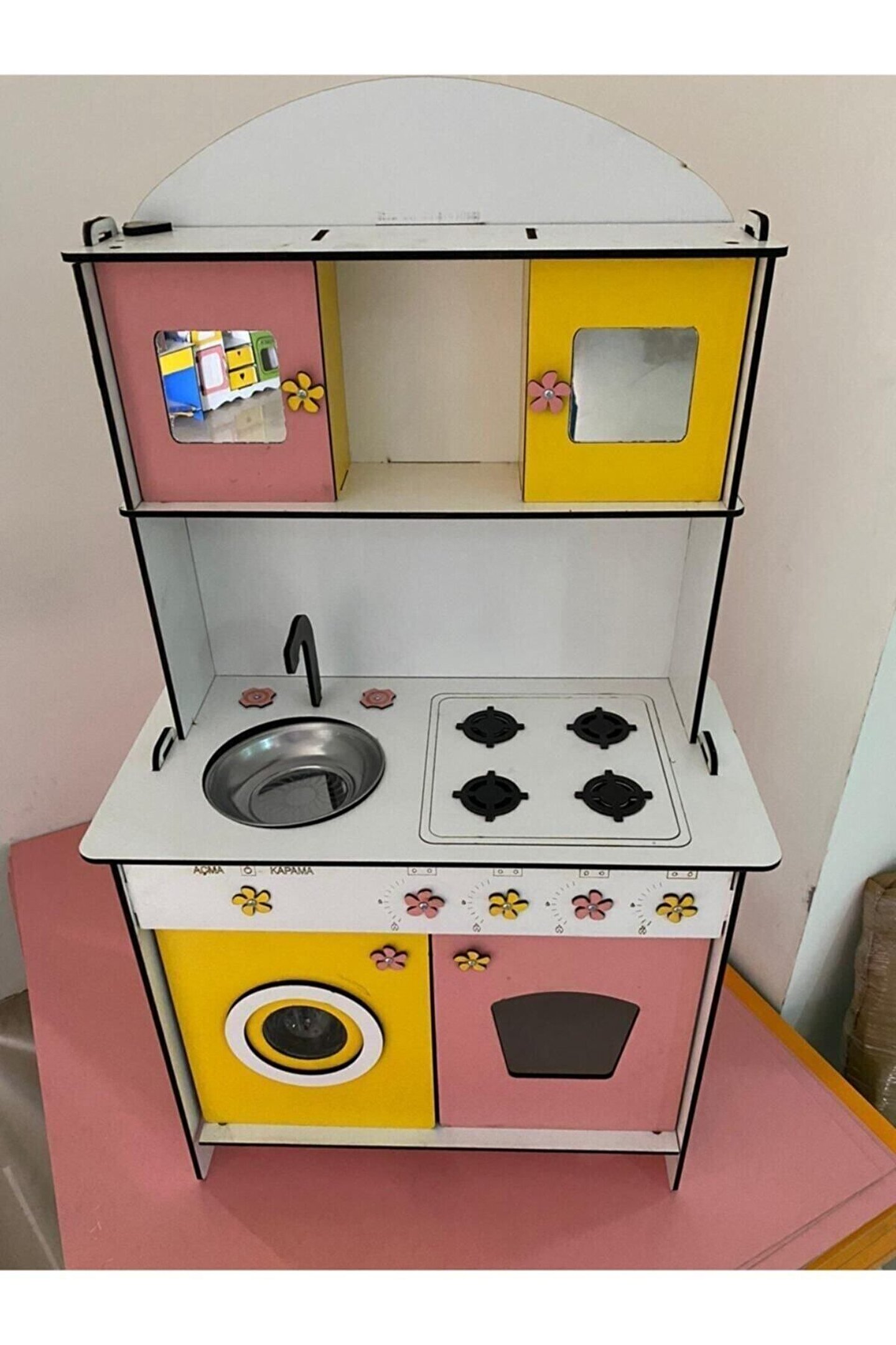 Ürün kendi imalatımız olup 6 mm MDF'den üretilmektedir. ; 106x60 ölçülerinde çocuğun ayakta rahatlıkla oynayabileceği boyuttadır ; Çocukların motor becerileri ve hayal güçleri gelişimini destekleyen harika tasarım gelişim oyuncağıdır ; Ürünümüzü sipariş verdikten sonra msj ile renk belirtebilirsiniz, renk belirtilmezse görseldeki ürünün aynısı gönderilir. ; Doğum günü hediyesi olarak tercih edilen ürünler arasındadır. Evcilik oyuncakları , oyuncak mutfak setleri, eğitici oyuncaklar , kız çocuk oyuncakları alanında tercih edildiği gibi erkek çocuklar içinde oldukça talep gören bir oyuncaktır. ; Kargoda veya kurulum sırasında oluşabilecek kazara kırılma veya deformasyon olması durumunda hasarlı parçalar firmamız tarafından ücretsiz bir şekilde gönderilmektedir, hasarlı parçanın görselini atmanız yeterlidir. ; Not; ürün özellikleri, ölçüler ve kullanılan malzemeler açıkça belirtilmiştir. Ürün iadesi kabul edilmemektedir buna göre sipariş verilmesini rica ederiz. ; İSTEĞE BAĞLI OLARAK KAPAKLARA 30 TL EK ÜCRET İLE AYNALI PLEKSİ TAKILABİLİR. ;