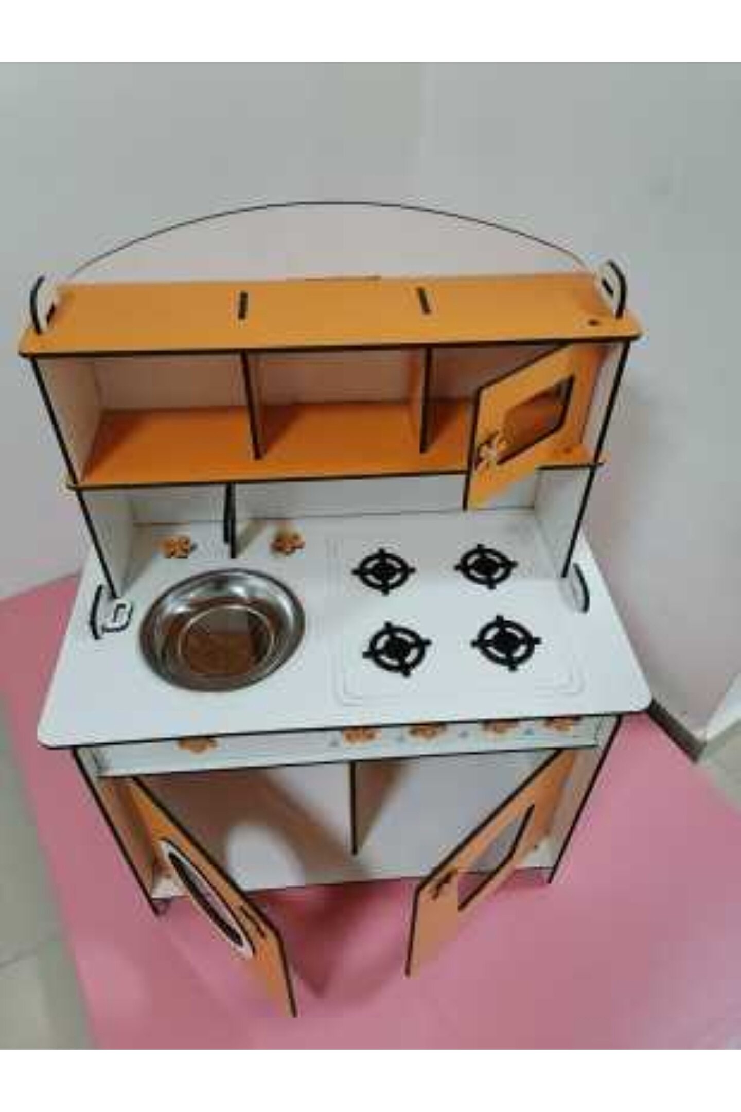 - Montessori prensiplerine uygun tasarlanmış, çocukların kendi kendine öğrenme yeteneklerini geliştiren eğitici oyuncaktır.; - 6.4mm dayanıklı ahşap malzemeden üretilmiş olup, uzun ömürlü kullanım sunar.; - Kolay montaj imkanı sayesinde ebeveynlerin de kolayca kurabileceği şekilde tasarlanmıştır; böylece çocuğunuzla kaliteli zaman geçirmenize olanak tanır.; - Renkli ve canlı görünümüyle dikkat çeken bu mutfak dolabı, çocuk odalarına neşe katarken aynı zamanda estetik bir dokunuş sağlar.; - Üç yaş ve üzeri çocuklar için idealdir; motor becerilerinin gelişimine katkıda bulunurken hayal gücünü de teşvik eder.; - Canlı turuncu rengi ile enerjik ve pozitif bir atmosfer oluşturarak çocukların ilgisini çekmeyi başarır.; -Türkiye'de üretilmiştir; yerel kaynakların korunmasına destek olmanın yanı sıra ekonomimize katkıda bulunur.