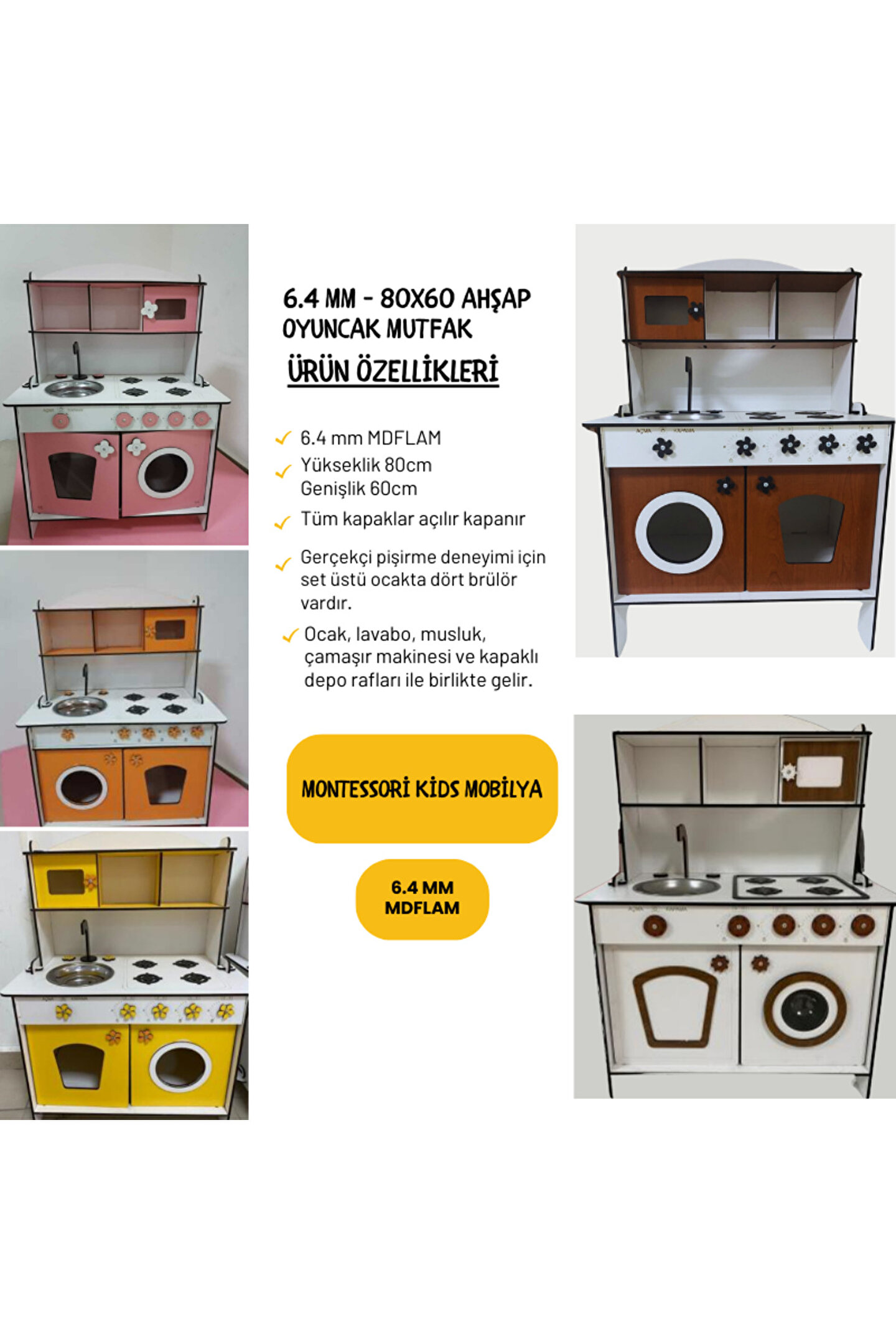 ? Pembe kaplamalı 6mm MDFLAMmalzemeden el yapımı. ?Yükseklik 80cm, genişlik 60cm. 3 yaş ve üstü çocuklar için saatlerce yaratıcı oyun sağlamak üzere tasarlanmıştır. ; Ocak, lavabo, musluk, çamaşır makinesi ve kapılı depo rafları ile birlikte gelir. ; Gerekli tüm parçaları içerir: Vidalar, mandallar ve kulplar. ; Dayanıklı yapısı uzun ömürlü kullanım sağlar. ; Düğmeler, kadranlar ve musluklar gibi gerçekçi detaylar. ; Gerçekçi pişirme deneyimi için set üstü ocakta dört brülör vardır. ; Çamaşır makinası menteşelidir ve gerçek bir makina gibi açılabilir. ; Tüm donanımlarıyla interaktif bir ortam yaratır. ; Güvenlik standartlarına uygun, toksik olmayan malzemelerden üretilmiştir. ; Oyuncak mutfak yaratıcılığı teşvik eder ve motor becerilerini geliştirir. ; Herhangi bir odaya veya köşeye sığacak mükemmel boyut. ; Çocuğunuz yemek pişiriyor, bulaşık yıkıyor, yemek hazırlıyor ve misafirlere servis yapıyormuş gibi davranarak saatlerce eğlenecek. ; Herhangi bir kreş veya oyun odasına mükemmel bir katkı ve doğum günleri, noel veya diğer özel günler için harika bir hediye fikridir. ; Doğum günü hediyesi olarak tercih edilen ürünler arasındadır. Evcilik oyuncakları, oyuncak mutfak setleri, eğitici oyuncaklar, kız çocuk oyuncakları alanında tercih edildiği gibi erkek çocuklar içinde oldukça talep gören bir oyuncaktır. ; ;