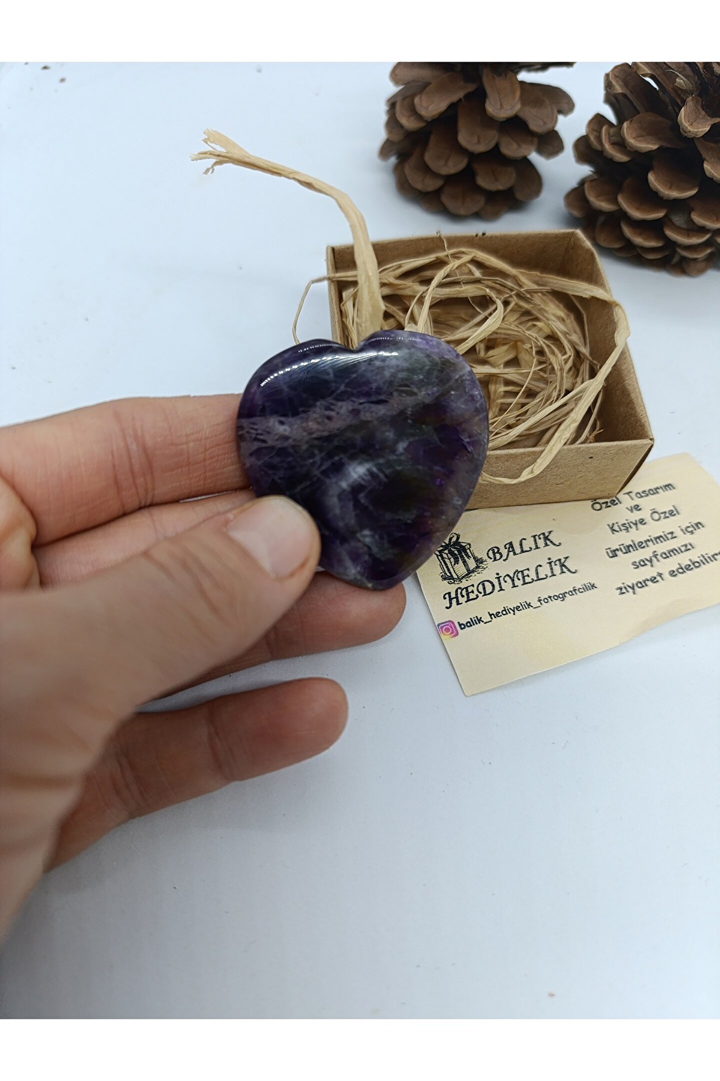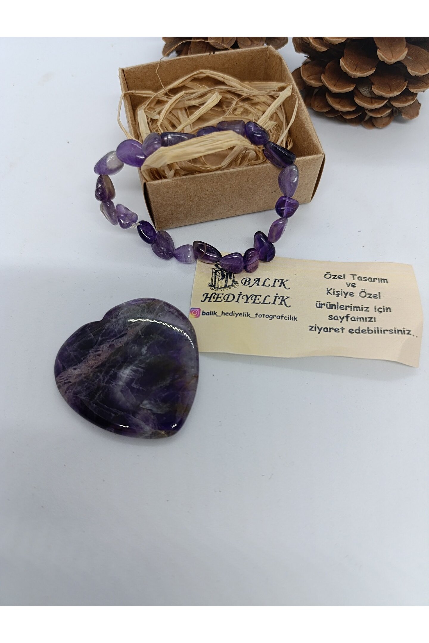 Görseldegördüğünüz ametist taşı kalp biblo ve tımbıl bileklik görselde görülen kutuiçerisinde gönderilecektir.