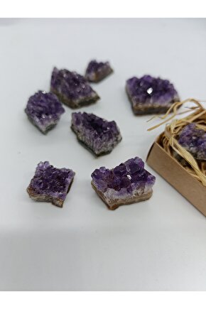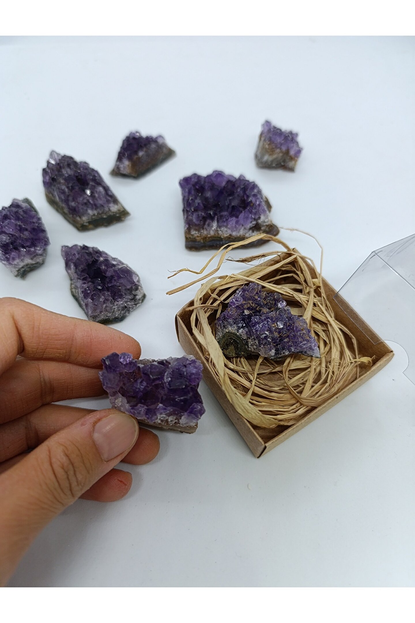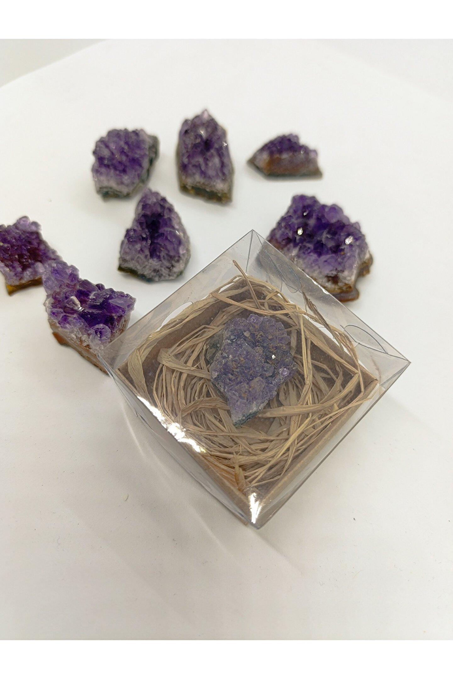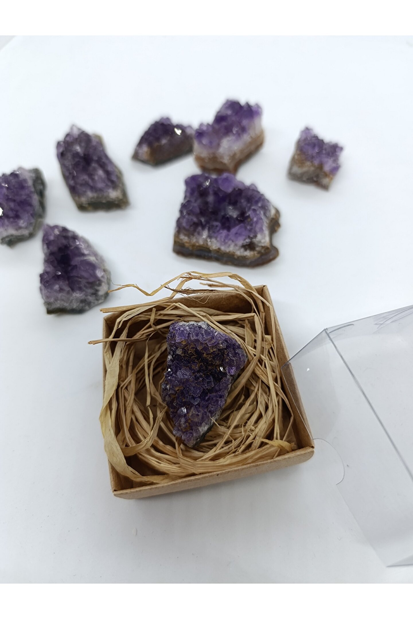 Görselde gördüğünüz ametist taşlarından bir tanesi yine görselde görülen kutu içerisinde gönderilecektir.