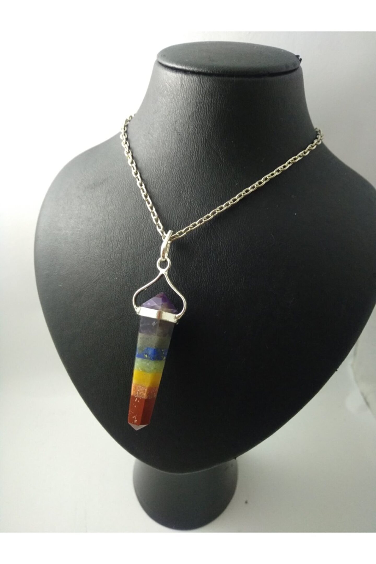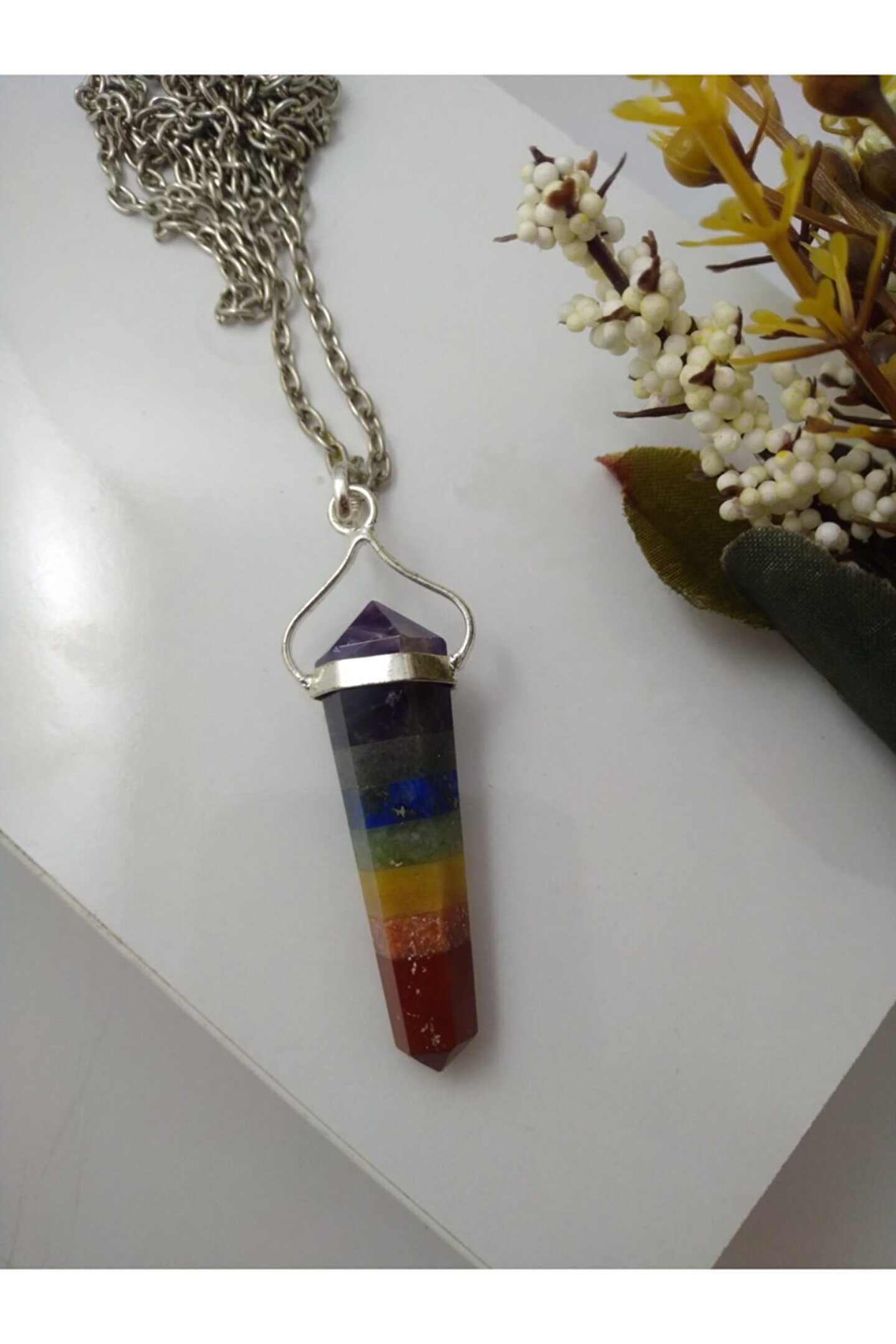 Çakra taşı kolye/ pandül şeklinde doğaltaş kolye Çakralar, bedenimizde bulunan enerji merkezleridir. Çakra sistemindeki temel amaç bedenin enerji merkezlerini harekete geçirerek sağlıklı çalışmasını sağlamak, ruhsal ve bedensel bütünlüğü oluşturmaktır. Ürünün özellikler I; Ürünlerimiz gerçek doğal taş olup pandül şekli ile tasarlanmıştır. Gövde kısmındaki metal gümüş olup, zincir gümüş değildir. Çakra kolyeleri, değişik 7 renkten oluşur. Her bir renk bir çakra katmanını simgeler. Ürünümüzde kullanılan çarka taşları; ametist, oniks, lapis lazuli,aventurin, sitsin, akik, jasper Ürünümüz size hediye kutusu içinde gönderilecektir. Parfüm, alkol v.B. Gibi maddeler ile temasından kaçınılmalıdır. Boyutu yaklaşık 3,5 cm'dir. 50-55 cm uzun zincir ile gönderim yapılır. Paket içeriği: 1 adet