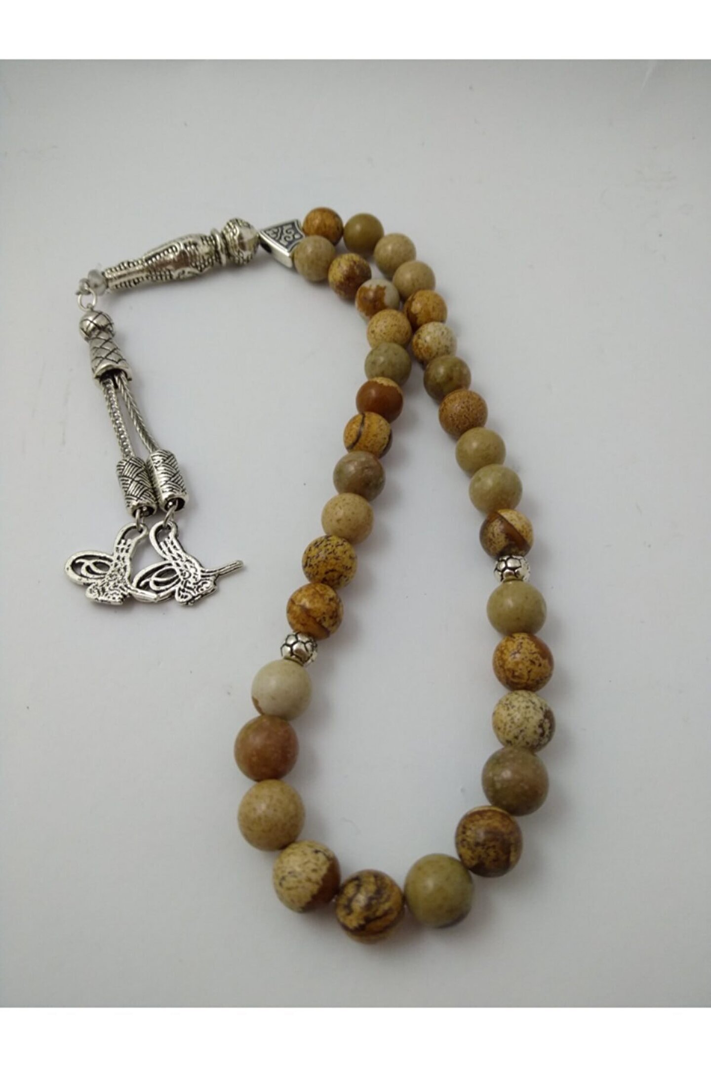Jasper taşı tespih / doğaltaş tespih Jasper (yaşam gücü taşı):Halk arasında çakmak taşı olarak bilinen jasper taşı renkli ve damarlı bir taştır. ; Başlıca renkleri kırmızı, sarı ,yeşil,mavi, turuncu ve kahverengi tonlardan karışık damarlı bir taştır. ; Dalmaçyalı modelide mevcuttur. ; Sigarayı bırakmak isteyenler bu taşı tercih edebilirler. ; Azim ve cesaret taşıdır. ; Sinirleri yumuşatır. ; Kan yapımıma yardım eder. ; Bedendeki zararlı toksinlerin temizlenmesinde etkili olduğu, bağışıklık sistemini güçlendirdiği bilinir.Doğurganlığı arttırdığı ve vücuttaki toksinleri yok ettiği bilinmektedir. ; **bu eşsiz özelliklere sahip doğaltaş tespih neden sizin veya sevdiklerinizin olmasın..**;