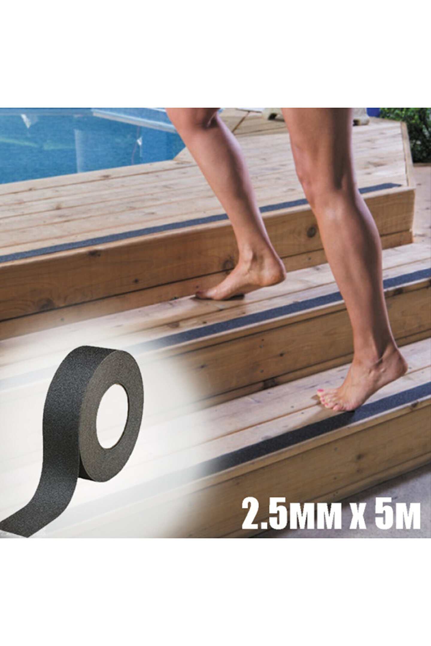 -5 metre uzunluğunda, 2,5 cm genişliğinde kaymaz bant, merdivenlerde güvenliği artırır ve kayma riskini minimize eder.; - Arkası yapışkanlı özelliği sayesinde kolayca uygulanabilir ve güçlü bir yapışma sağlar.; - Siyah renk seçeneği ile estetik bir görünüm sunarken, merdivenlerinize şık bir dokunuş katar.; - 1. kalite malzemeden üretilmiş olup, uzun ömürlü kullanım vaat eder.