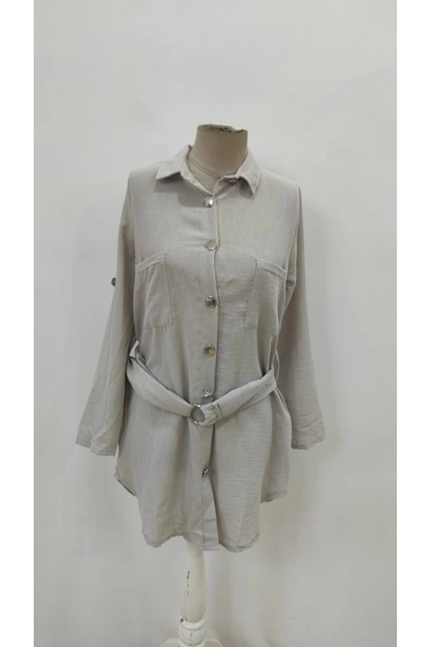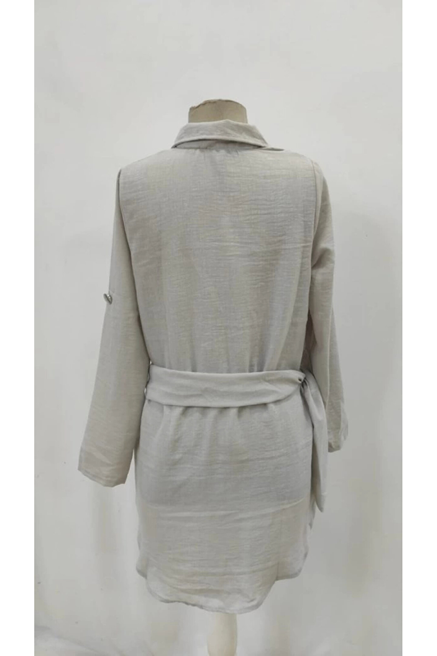 Barış Beauty Kadın Uzun Kollu Yakalı önden Düğmeli Beli Kuşaklı Mini Ithal Keten Elbise