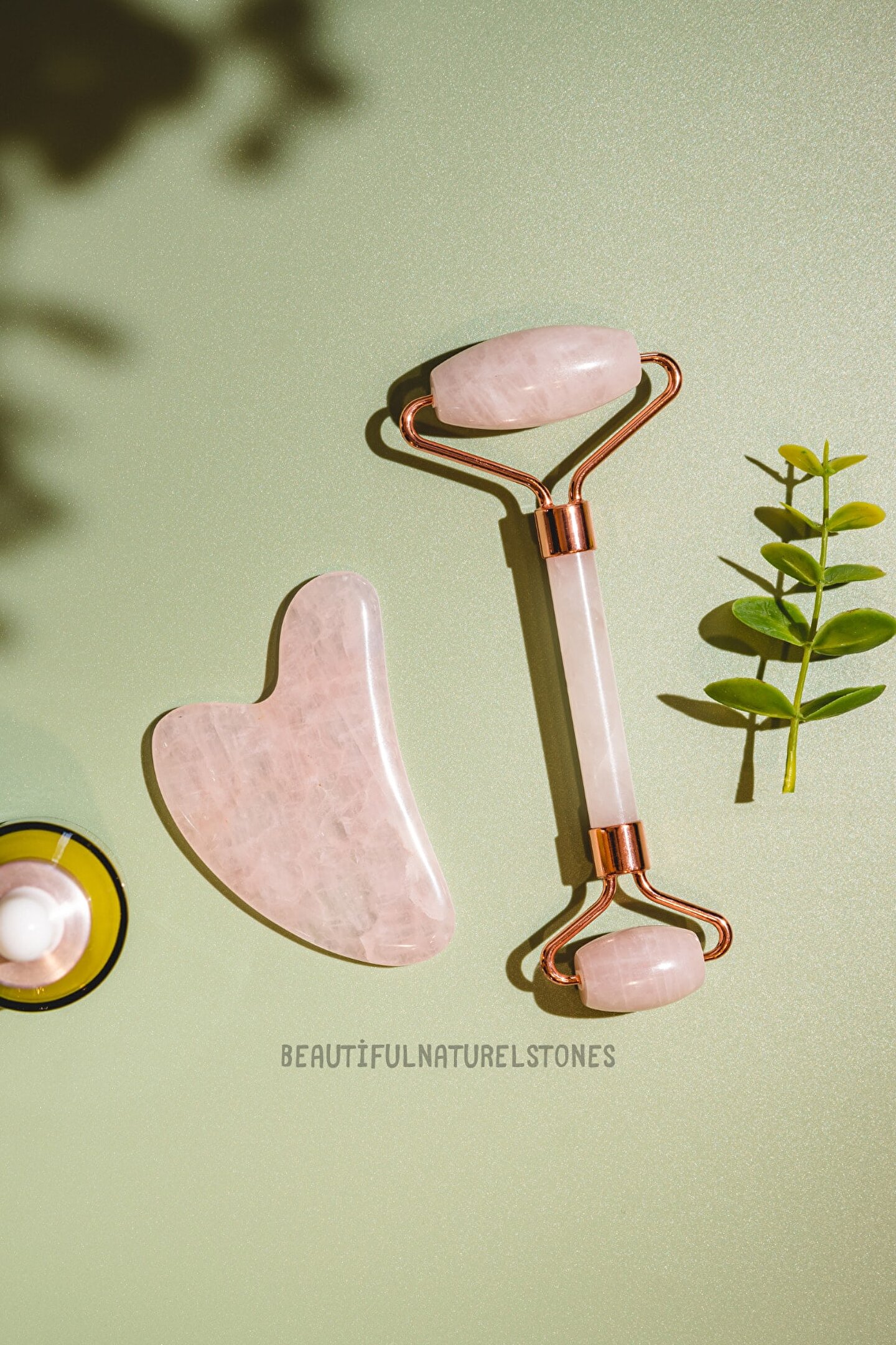 beautifulnaturelstones Pembe Kuvars Gua Sha Ve Roller Birinci Sınıf Set
