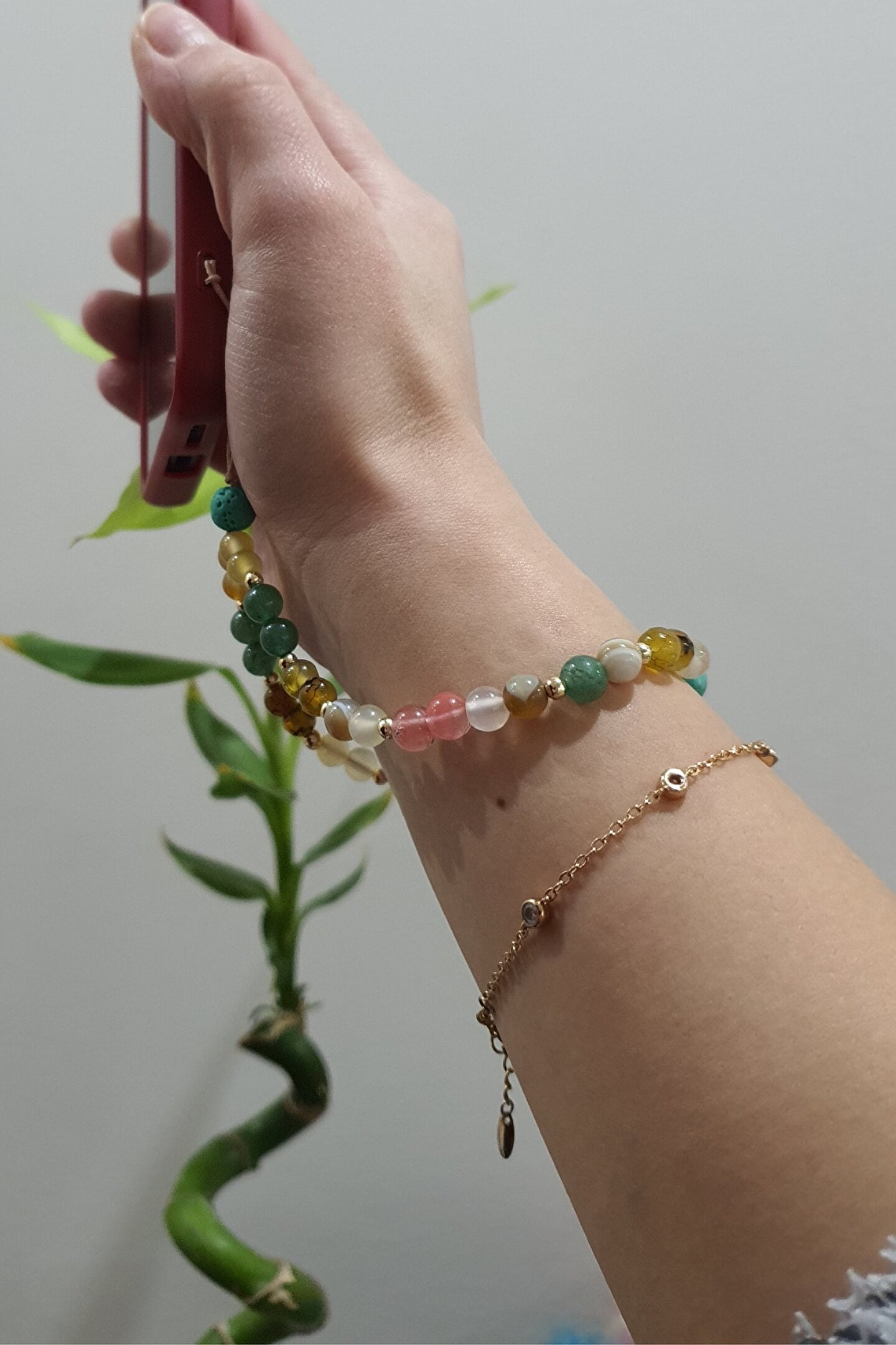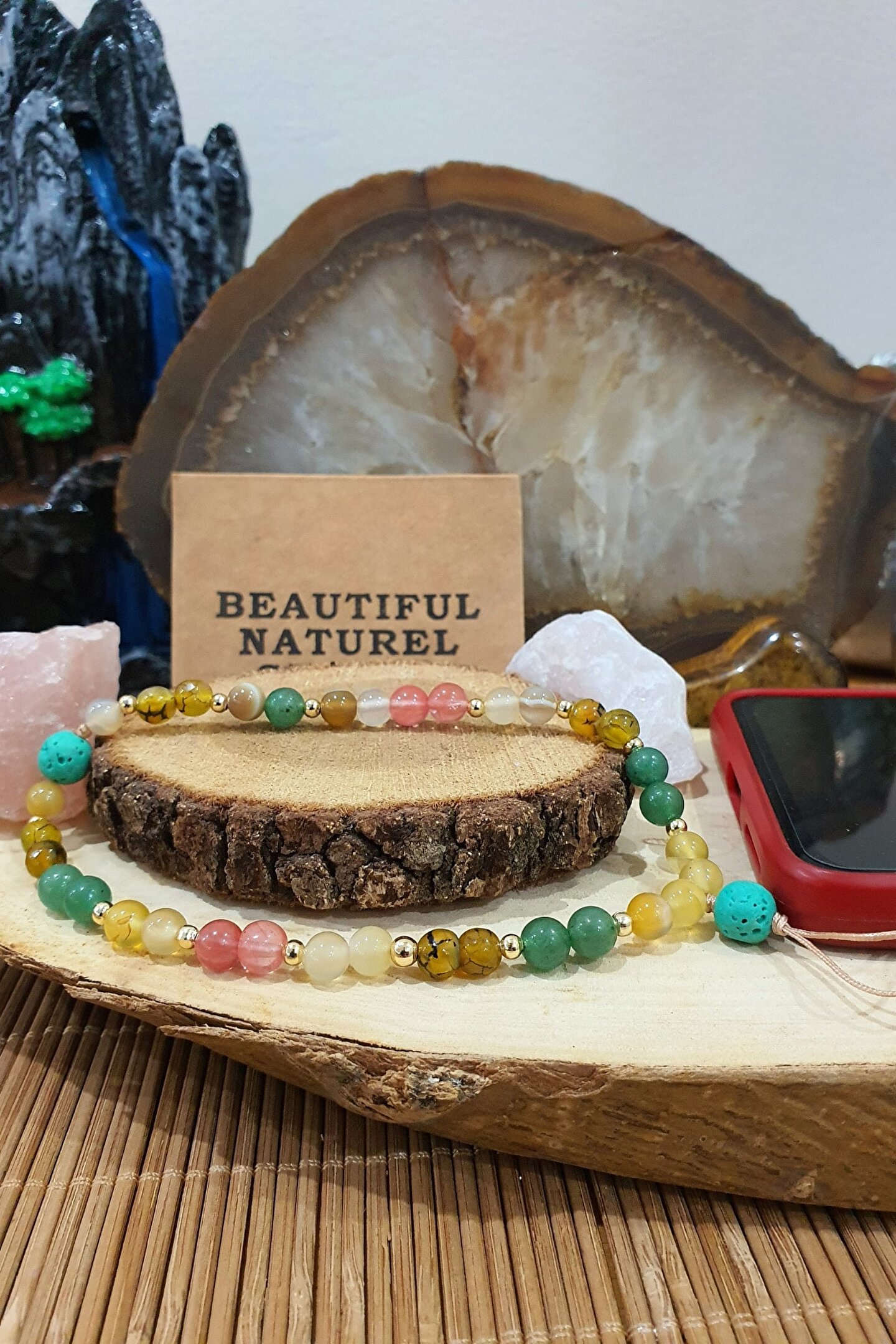 - Akik, aventurin ve lav taşı gibi doğal taşların birleşimiyle tasarlanmış, nazar boncuğu temalı charm; - Manyetik alan temizliği özelliği sayesinde, telefonunuzun enerjisini dengeler ve pozitif bir etki sağlar; - Zarif ve şık tasarımıyla, kişisel aksesuarlarınız arasında göz alıcı bir detay olarak öne çıkar;