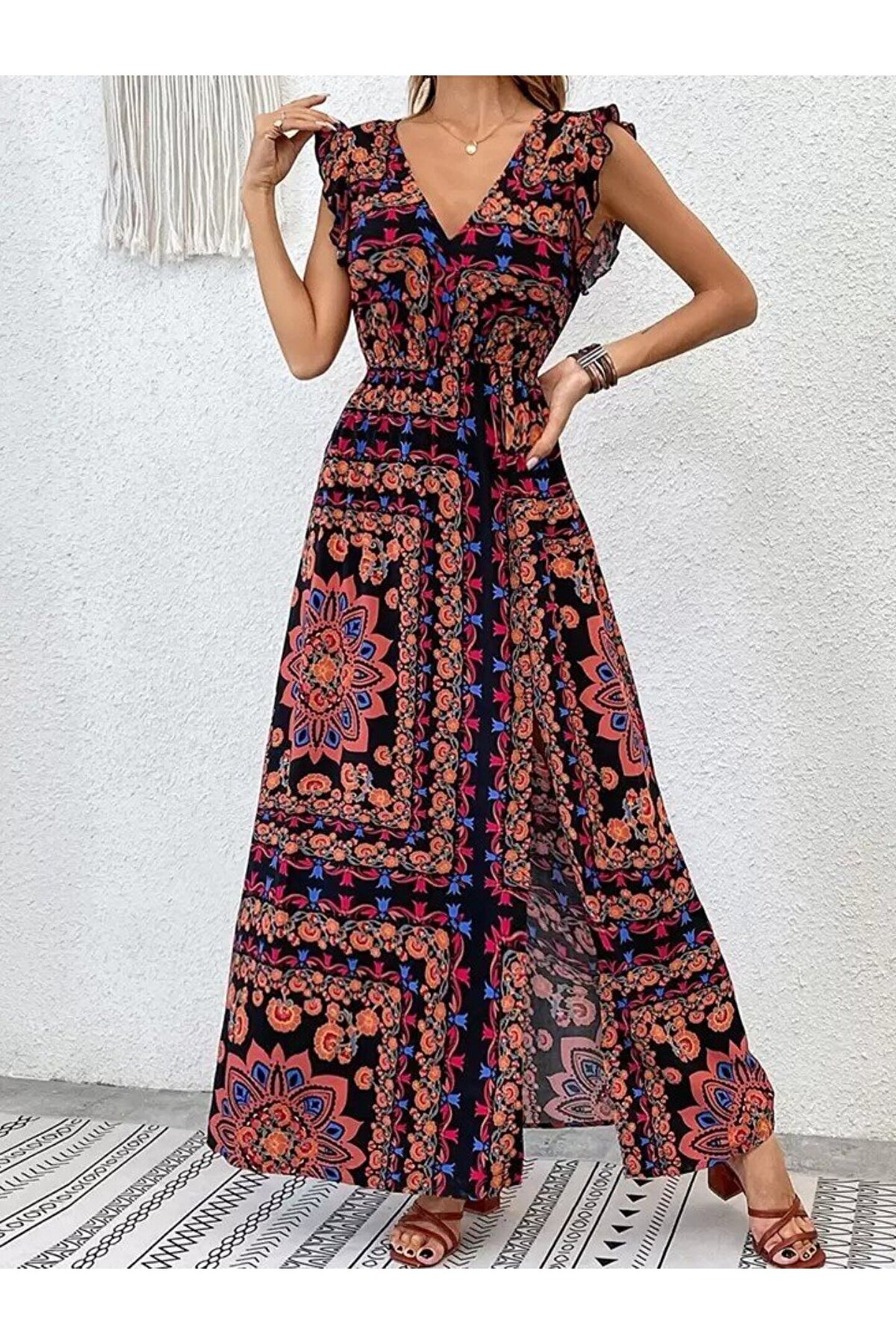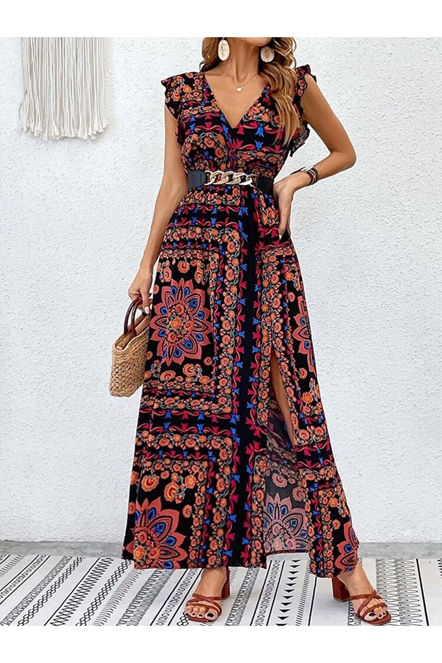 BEFAON EQURİ Kadın Kısa Kollu V Yakalı Deseni Yırtmaçlı Süprem Elbise