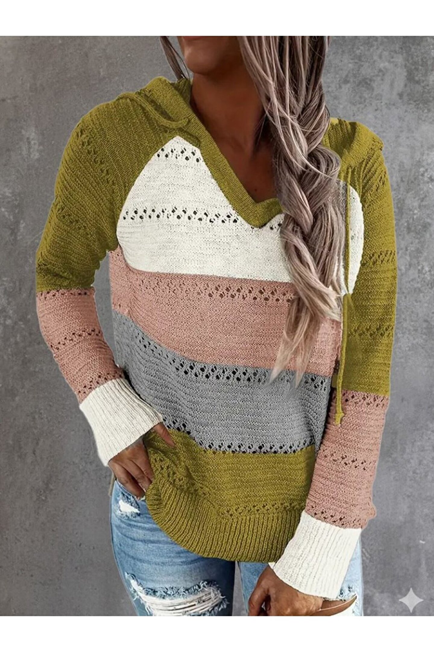 BEFAON EQURİ Kadın Uzun Kollu V Yakalı Bağcıklı Kapşonlu Triko Bluz