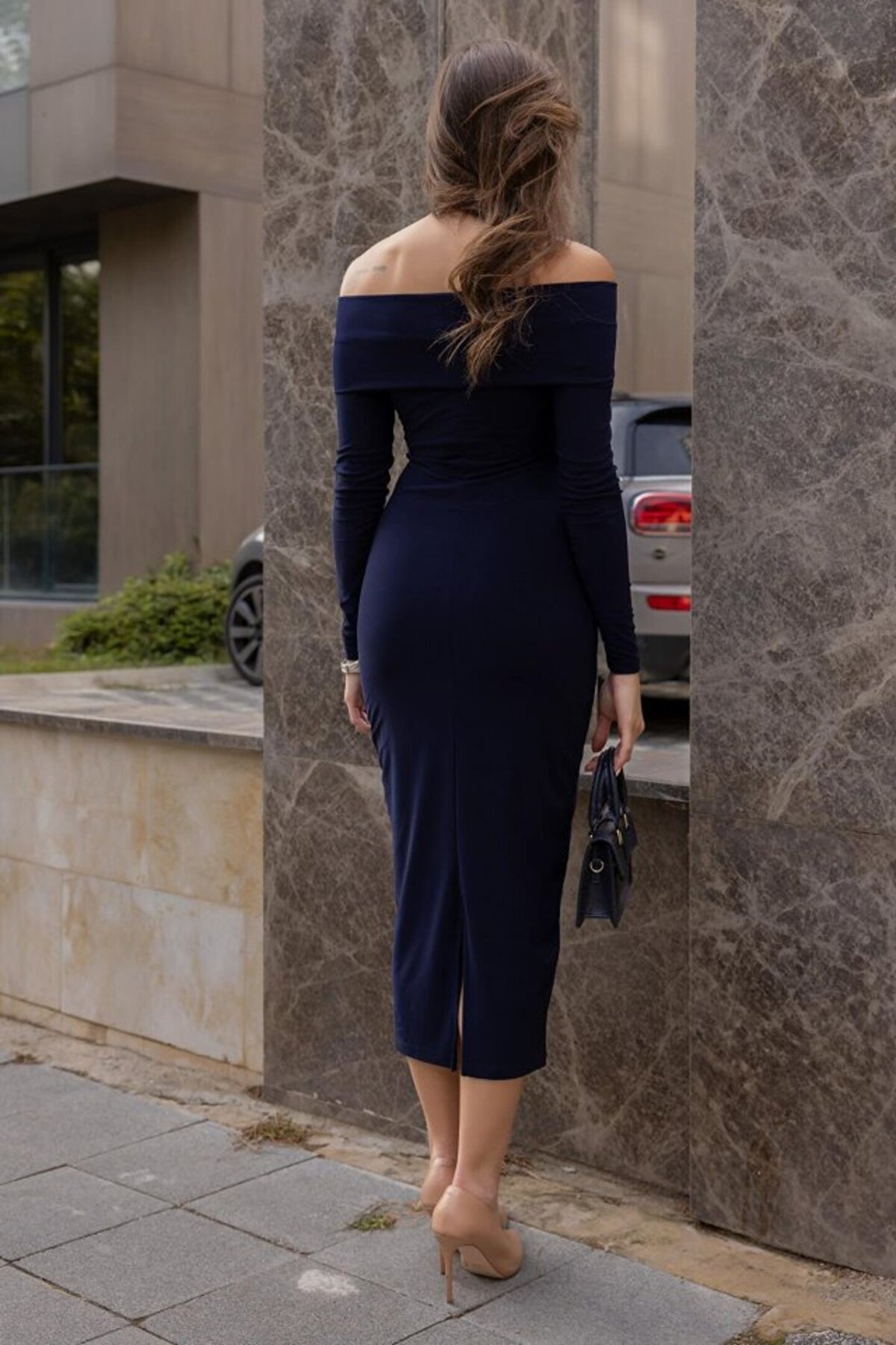 Kadın Uzun Kollu Madonna Yaka Düğüm Büzgü Detay Maxi Boy Elblbise