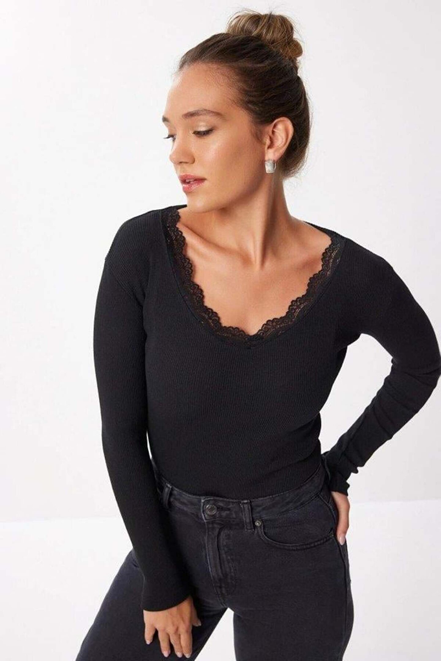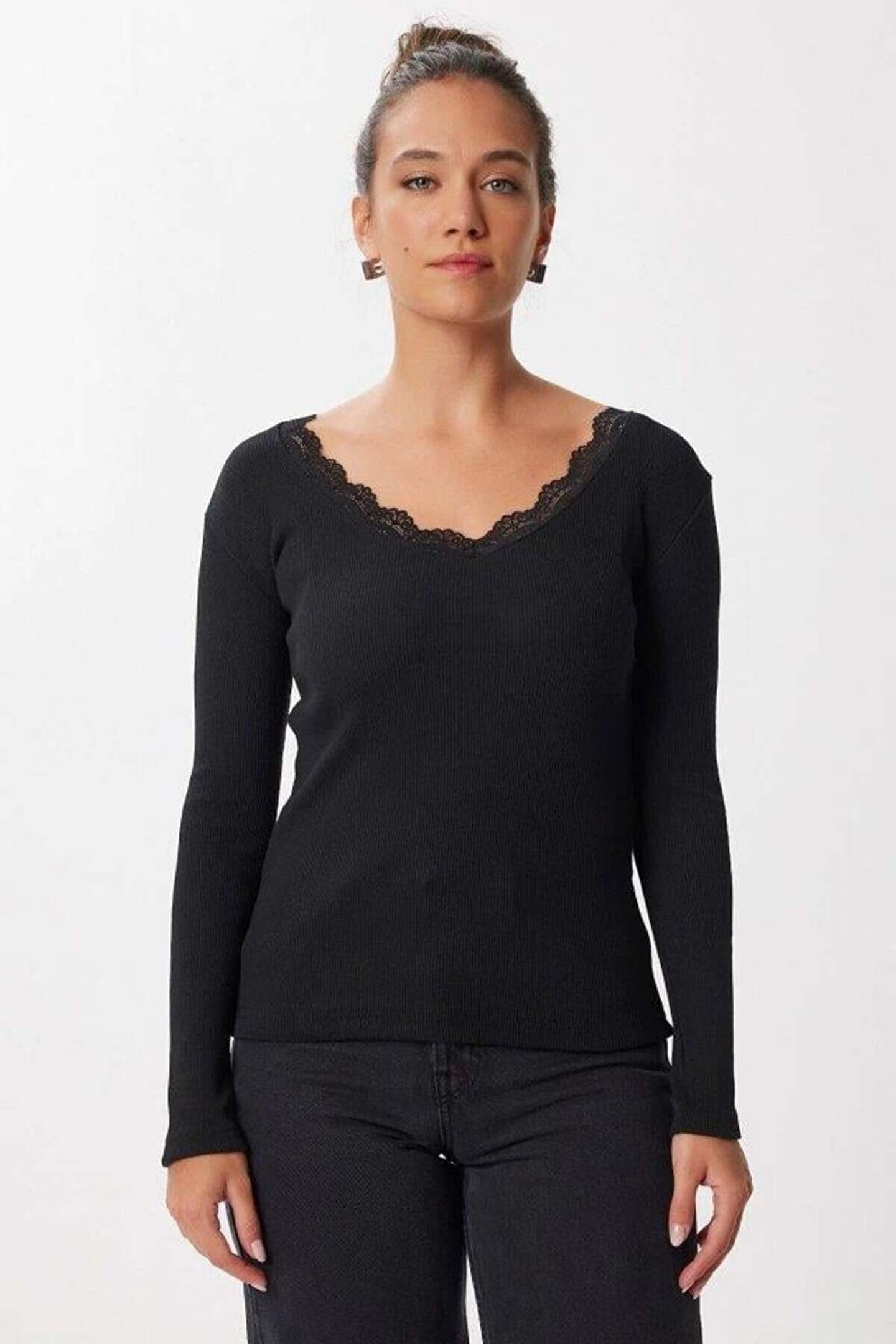 Kadın Dantel Detay V Yaka Kaskorse Kumaş Bluz