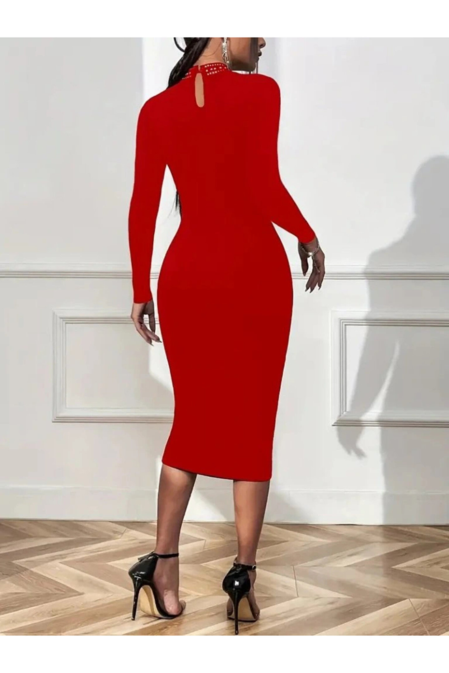 BEFAON Kadın Uzun Kollu Balıkçı Yaka Taşlı Damla Detay Midi Ithal Krep Elbise