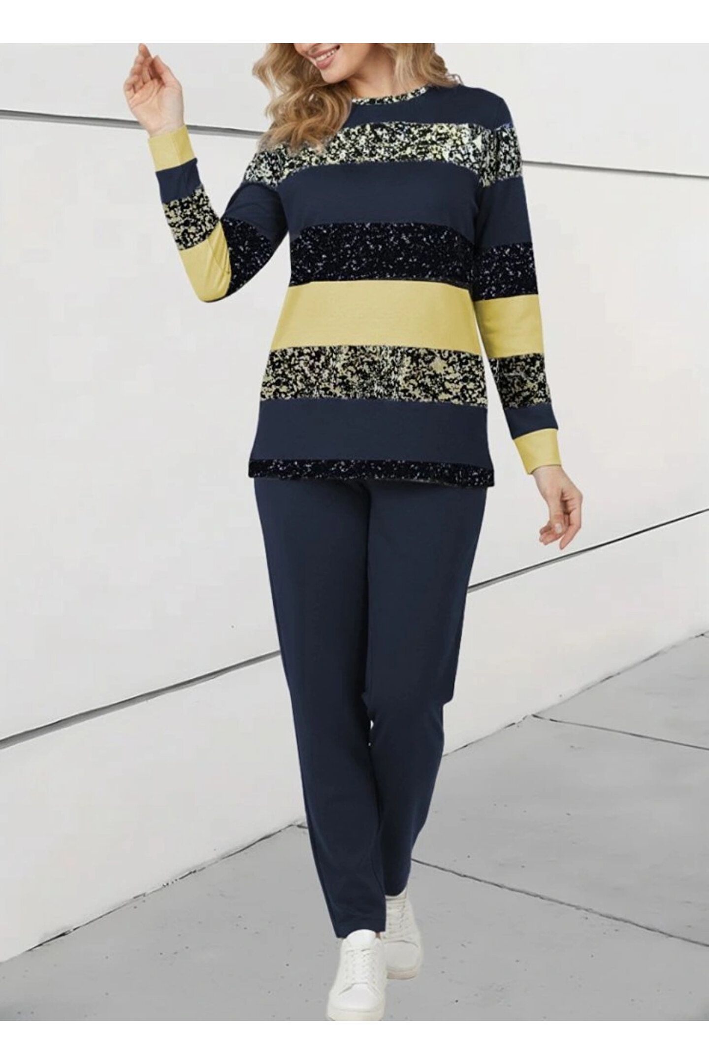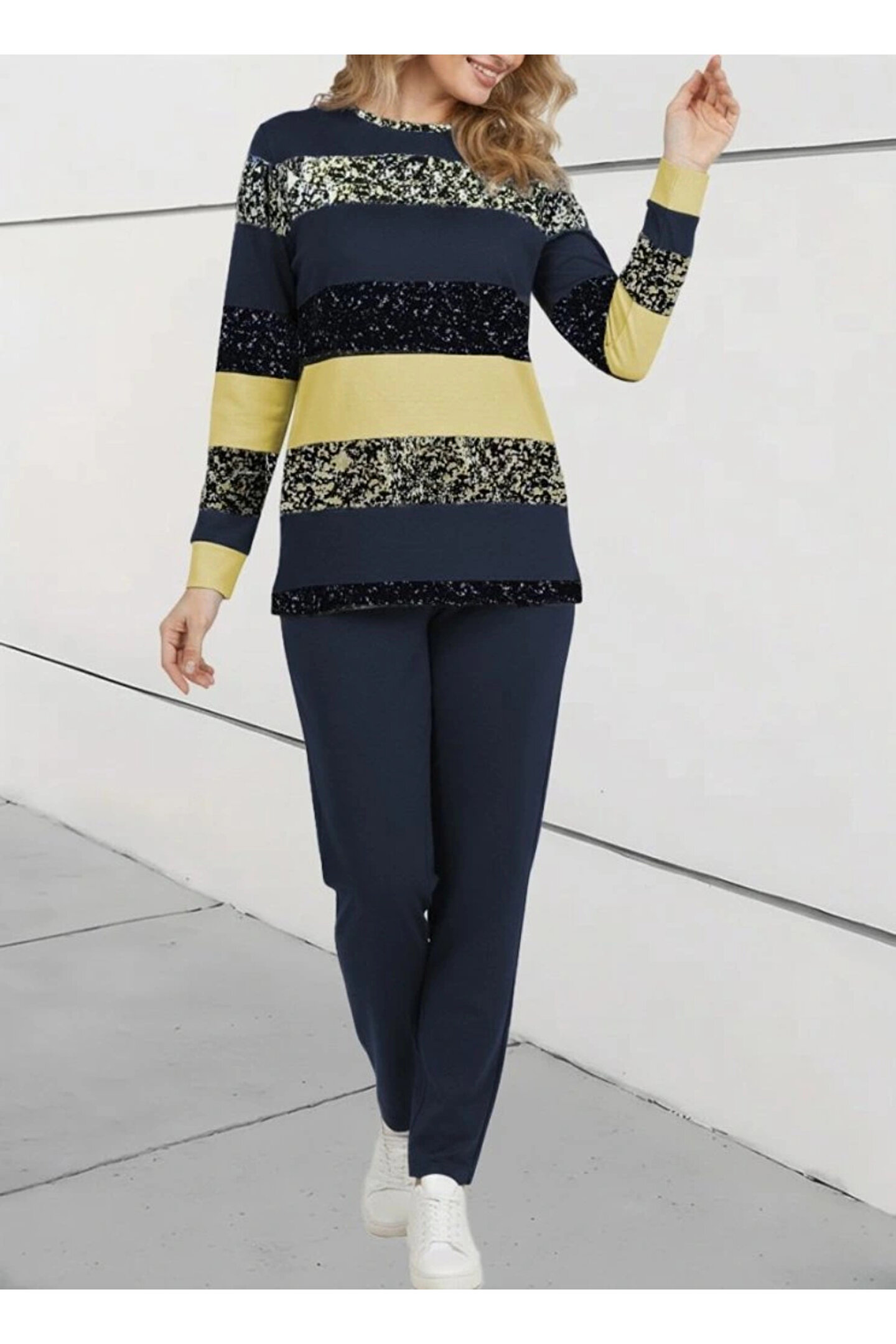 Kadın Uzun Kollu Bisiklet Yaka çizgili Desen Iki Iplik Bluz Ve Pantolon Ikili Takım