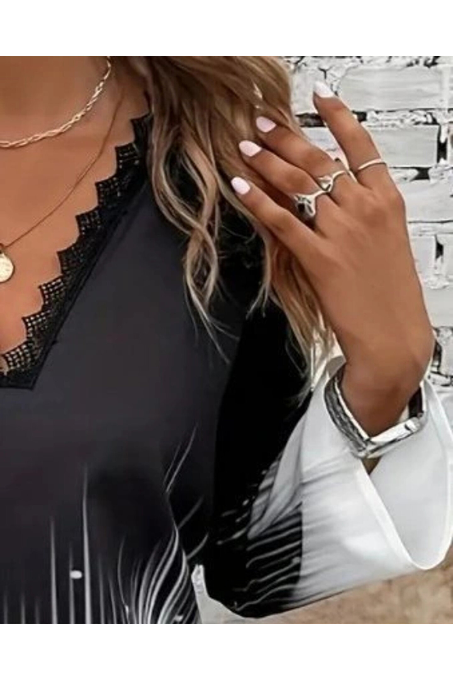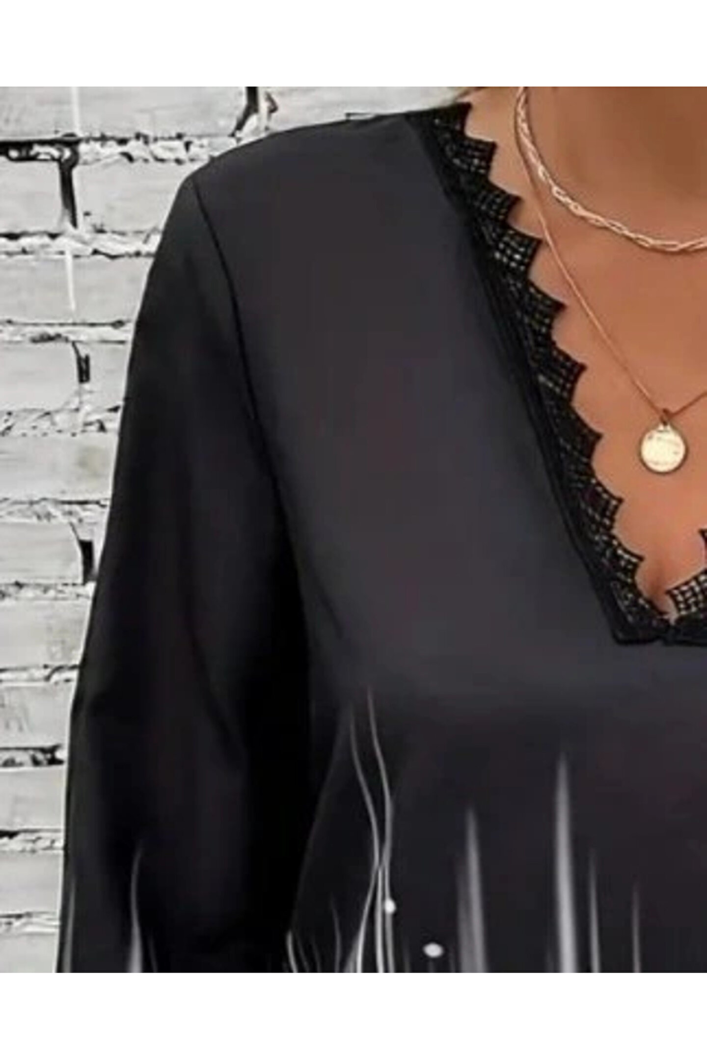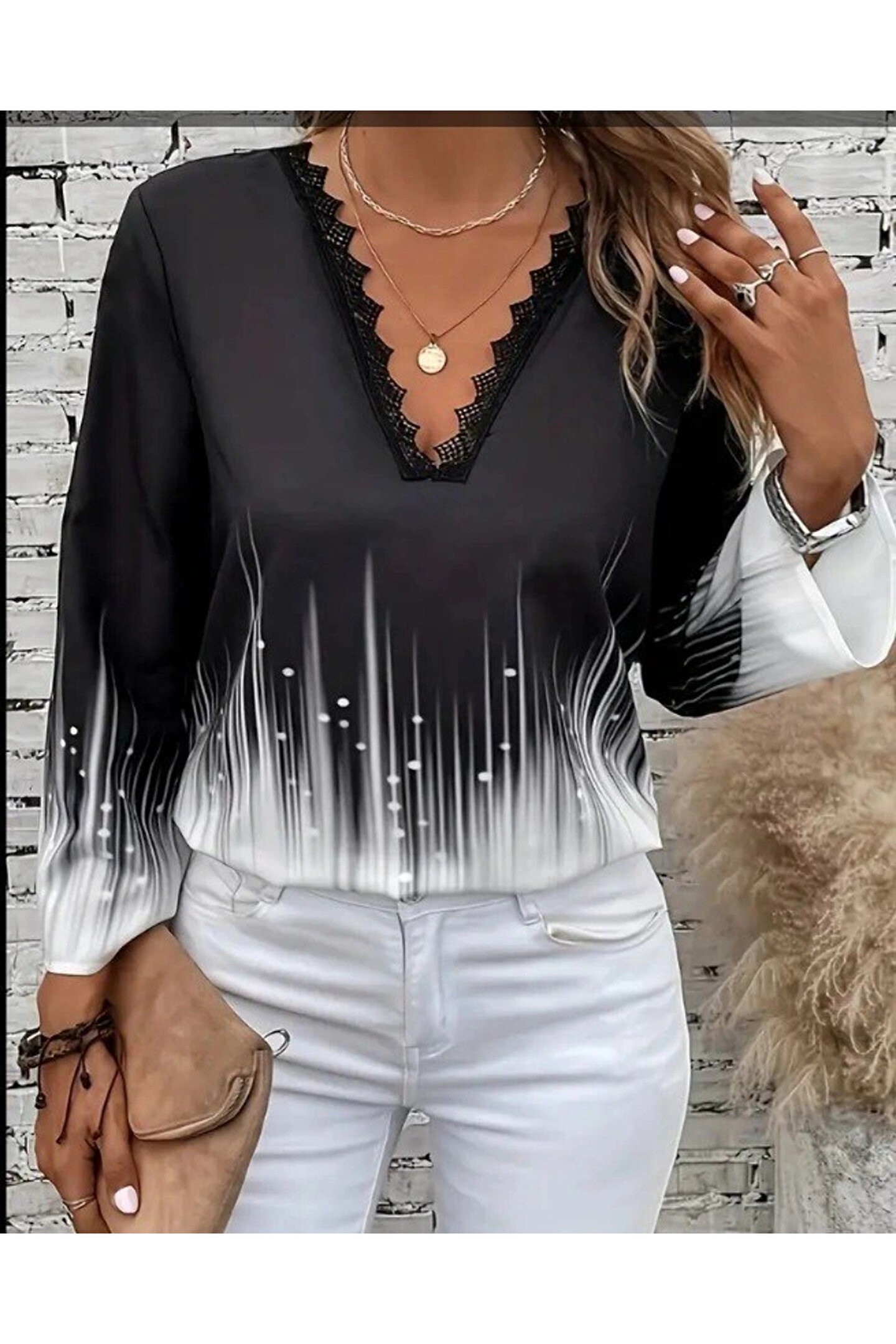 Kadın Uzun Kollu V Dantel Yaka Desenli Modal Bluz