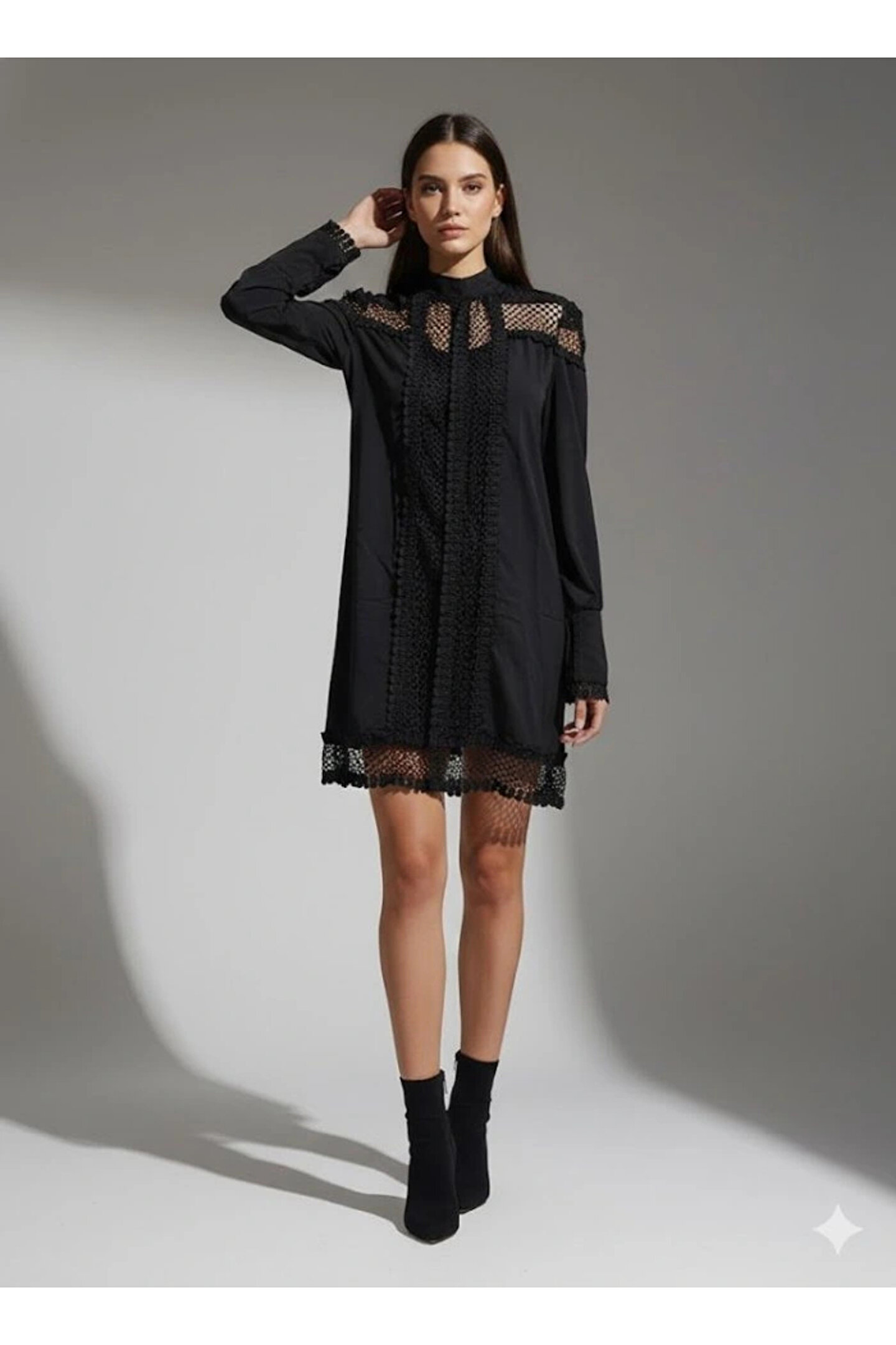 Kadın Uzun Kollu Yarım Balıkçı Yaka Transparan Detaylı Mini Elbise