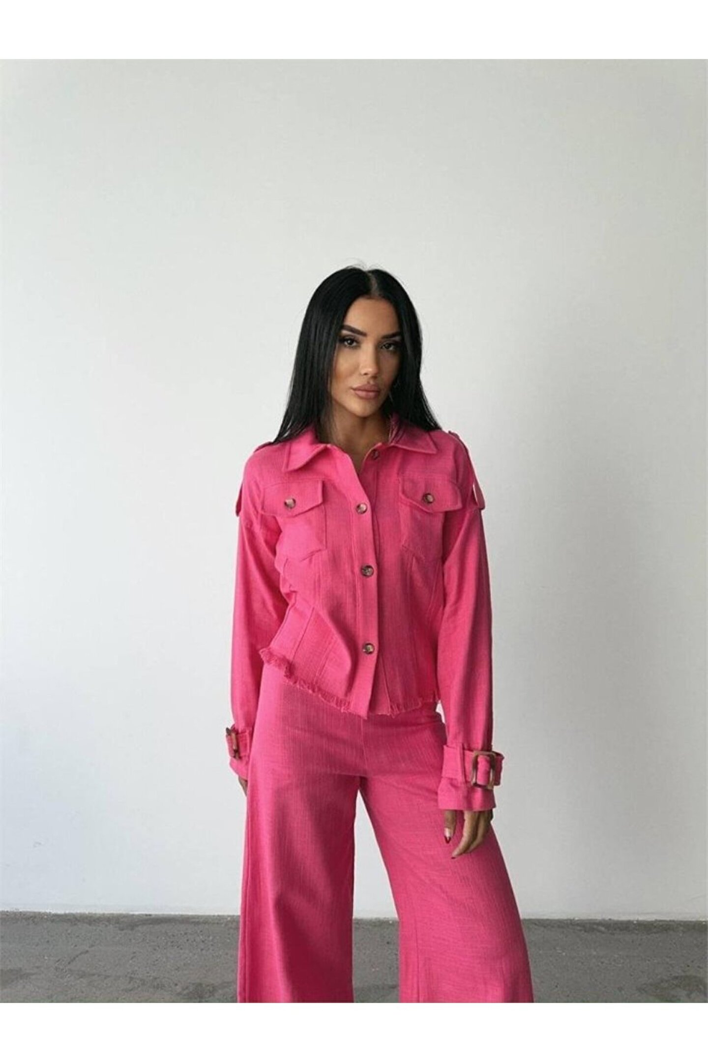 BEFAON KETEN PÜSKÜL DETAYLI GÖMLEK-PANTOLON TAKIM - Fuşya