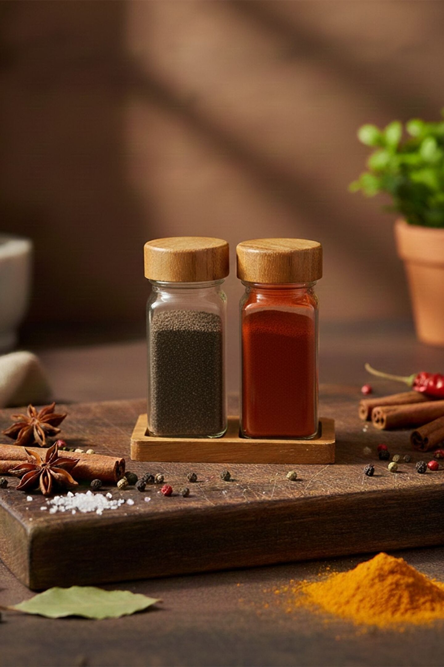 Bambu Kapaklı ve Standlı İkili Cam Baharatlık Seti - 120 ml