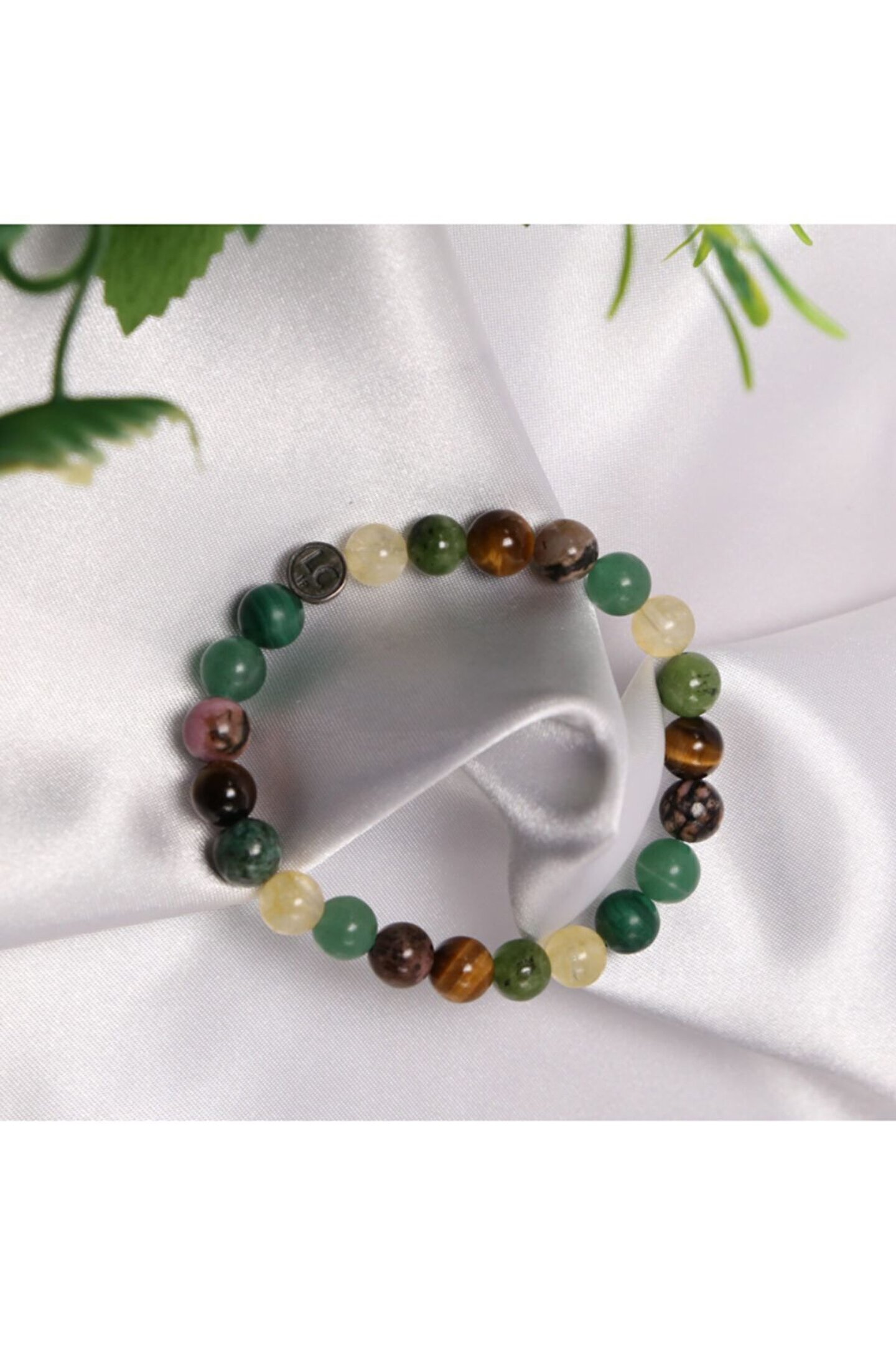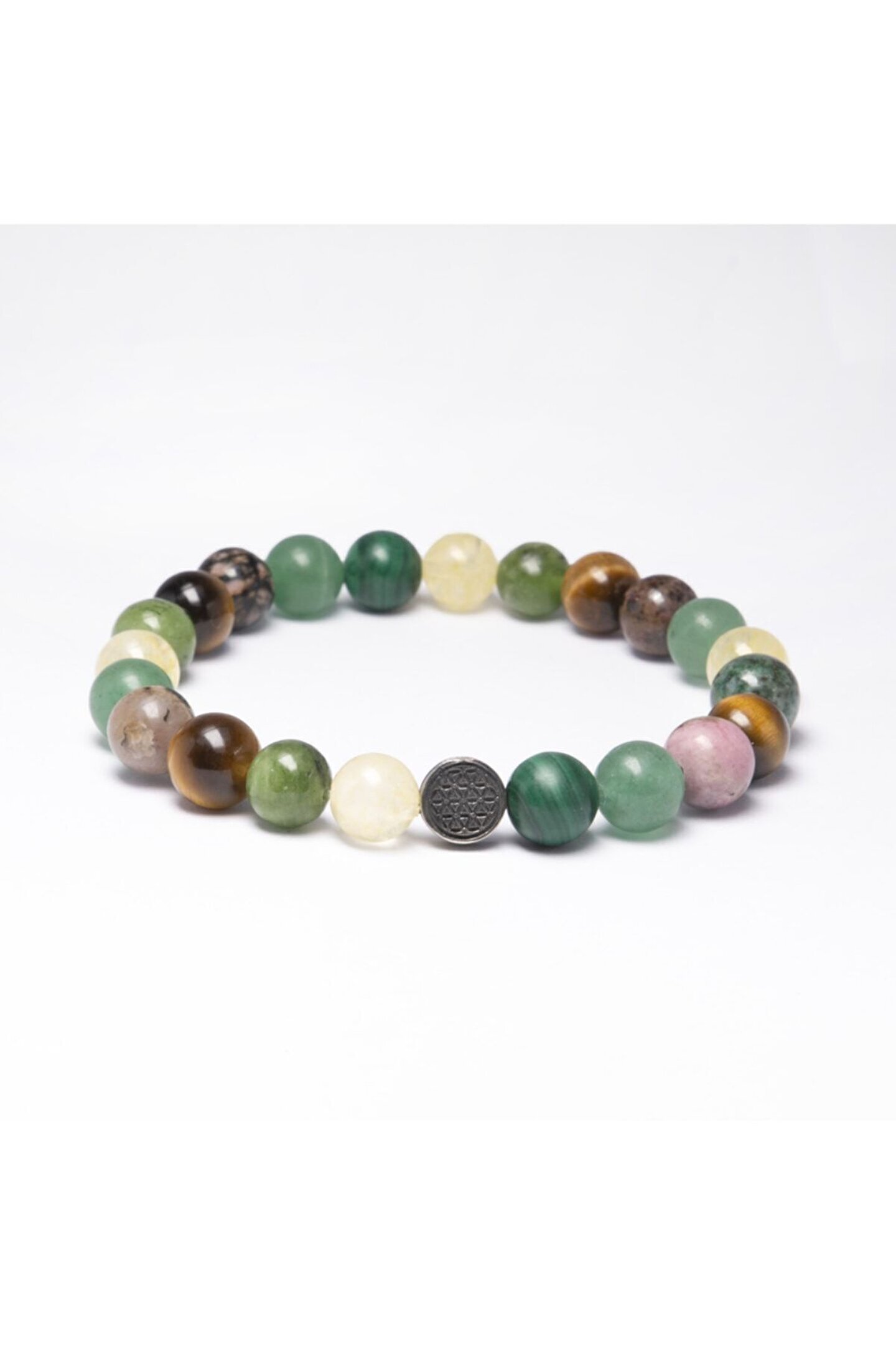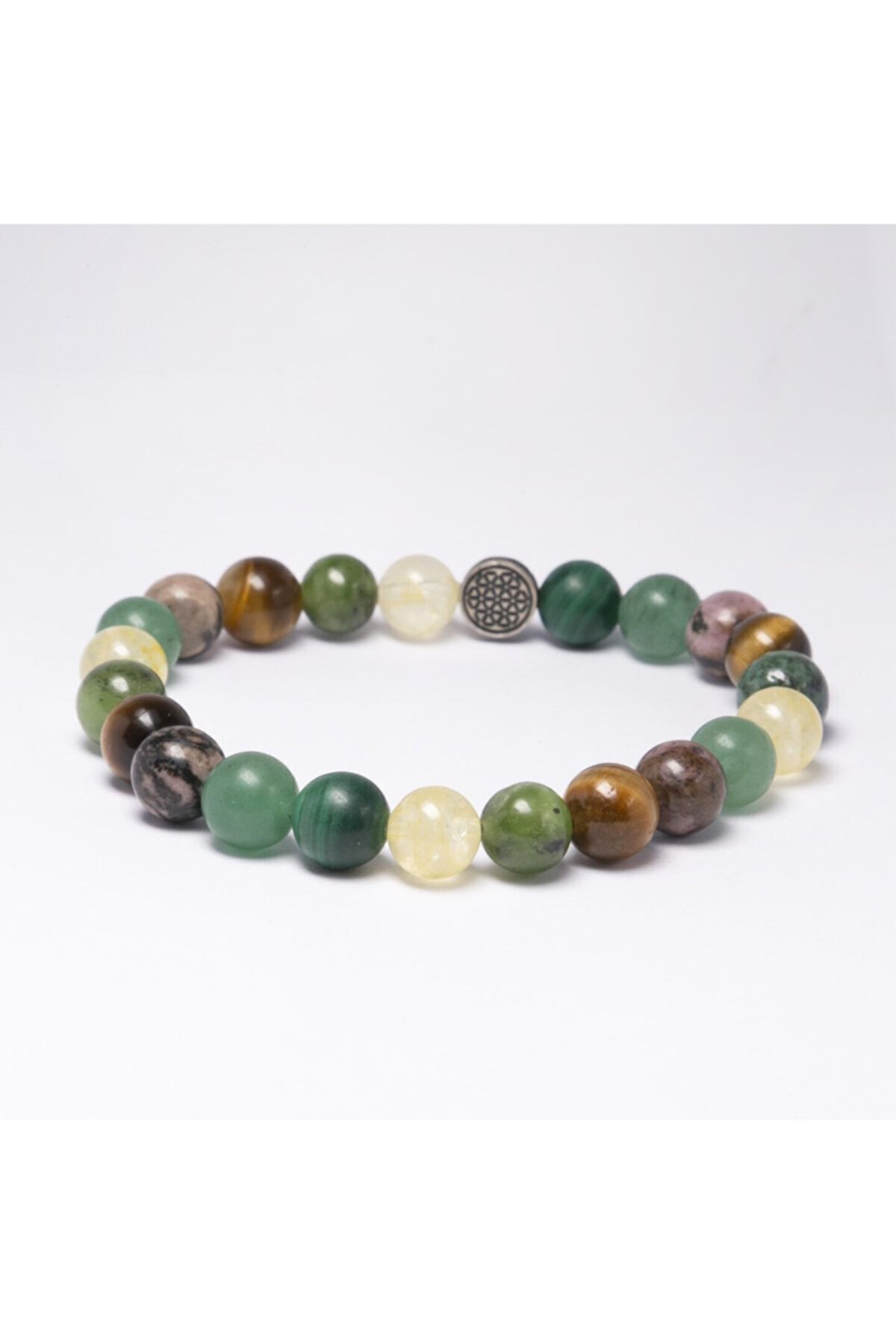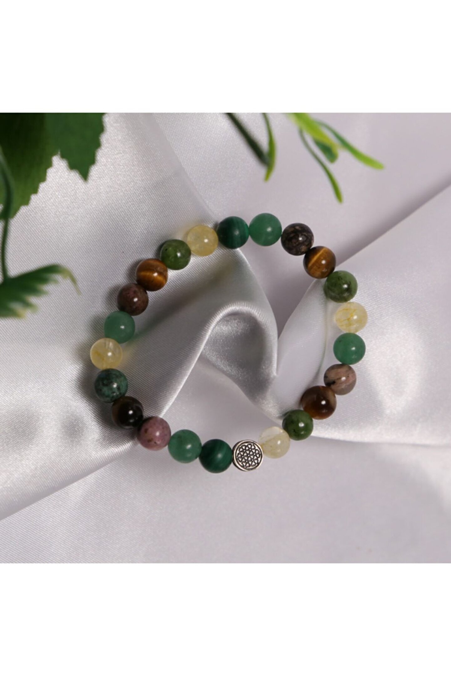 FİNANSAL BAŞARI, BOLLUK, BEREKET BİLEKLİĞİ; Yeşim: Ticaret hayatına bereket ve şans getirir.; Malakit: Daha iyi finansal kararlar almayı sağlar.; Sitrin: Finansal anlamda gelişme ve istikrar sağlar.; Aventurin: Paranın size dönmesi içn şans getirir.; Rodanit: Ekonomik olarak doğru kararlar vermenizi ve geçmiş hatalarınızdan sıyrılmanızı sağlar.; Kaplan Gözü: Hertürlü ofis ve çalışma alanlarında cesaret ve başarıyı getirir.; Her biri ayrı güce sahip olan bu kıymetli doğal taşlar güçlerini birleştirerek size maximum etkiyi getirir.; Sitrin Yeşim Kaplan Gözü Malakit Aventurin Bileklik Modelimiz ortalama 22-23 adet 8mm A kalite Gerçek Doğal Taştan oluşur.; Bileklikte kullanılan 925 ayar GÜMÜŞ üzerindeki yaşam çiçeği sembolü ile doğal taşın etkisi arttırılmıştır.; İnsan ve yaşamı muazzam geometrik orantısı ile ifade eden yaşam çiçeği sembolünün insana sağladığı faydalardan yaralanabilirsiniz.; Bileklik dayanıklı elastik ip nedeniyle her bileğe uyumludur. Siparişiniz özel Lc19 kutusunda gönderilecektir.;