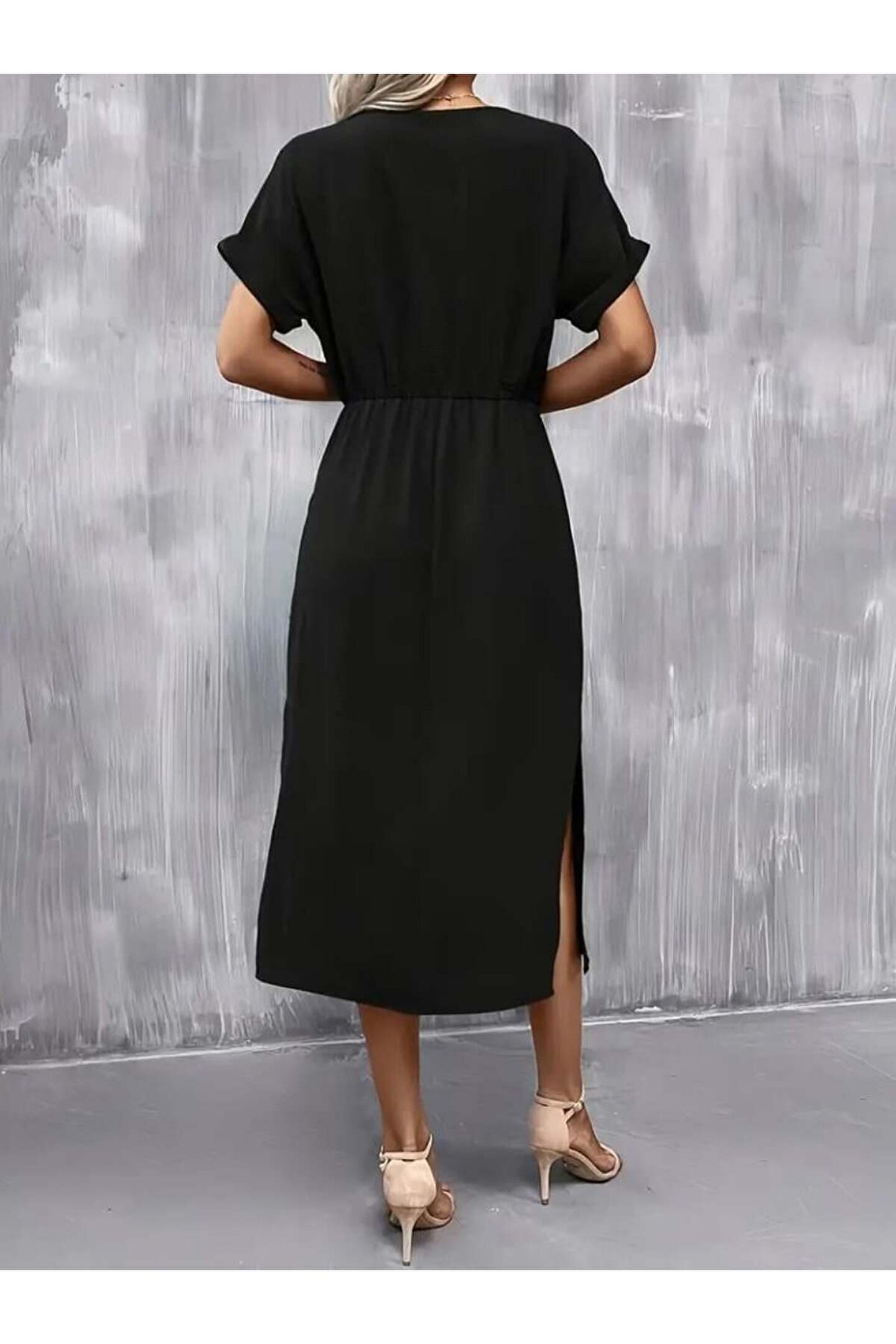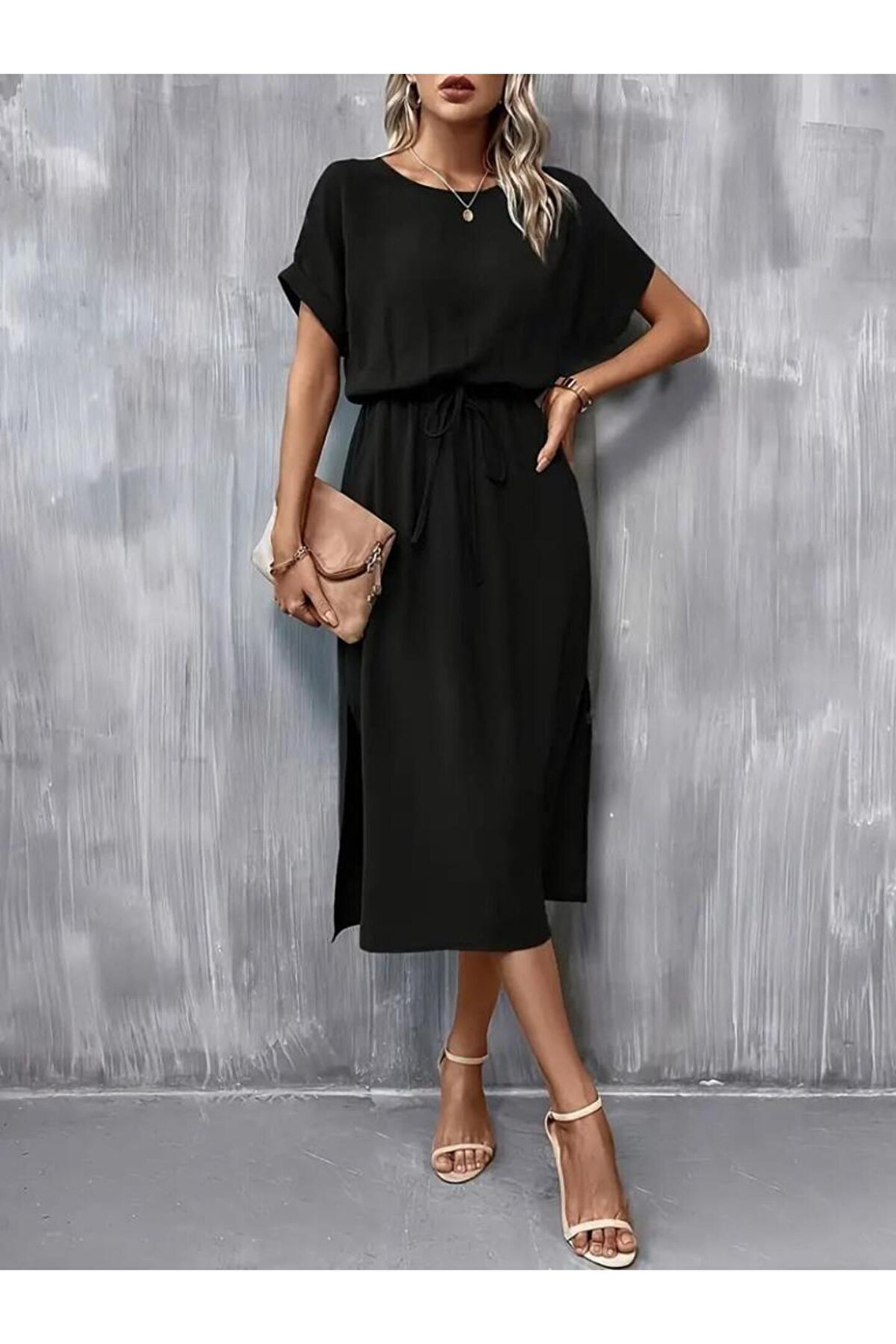 BETULAKSUBUTİK Kadın Kısa Kollu Yakası Açık Belden Bağlamalı Yırtmaçlı Viskon Elbise
