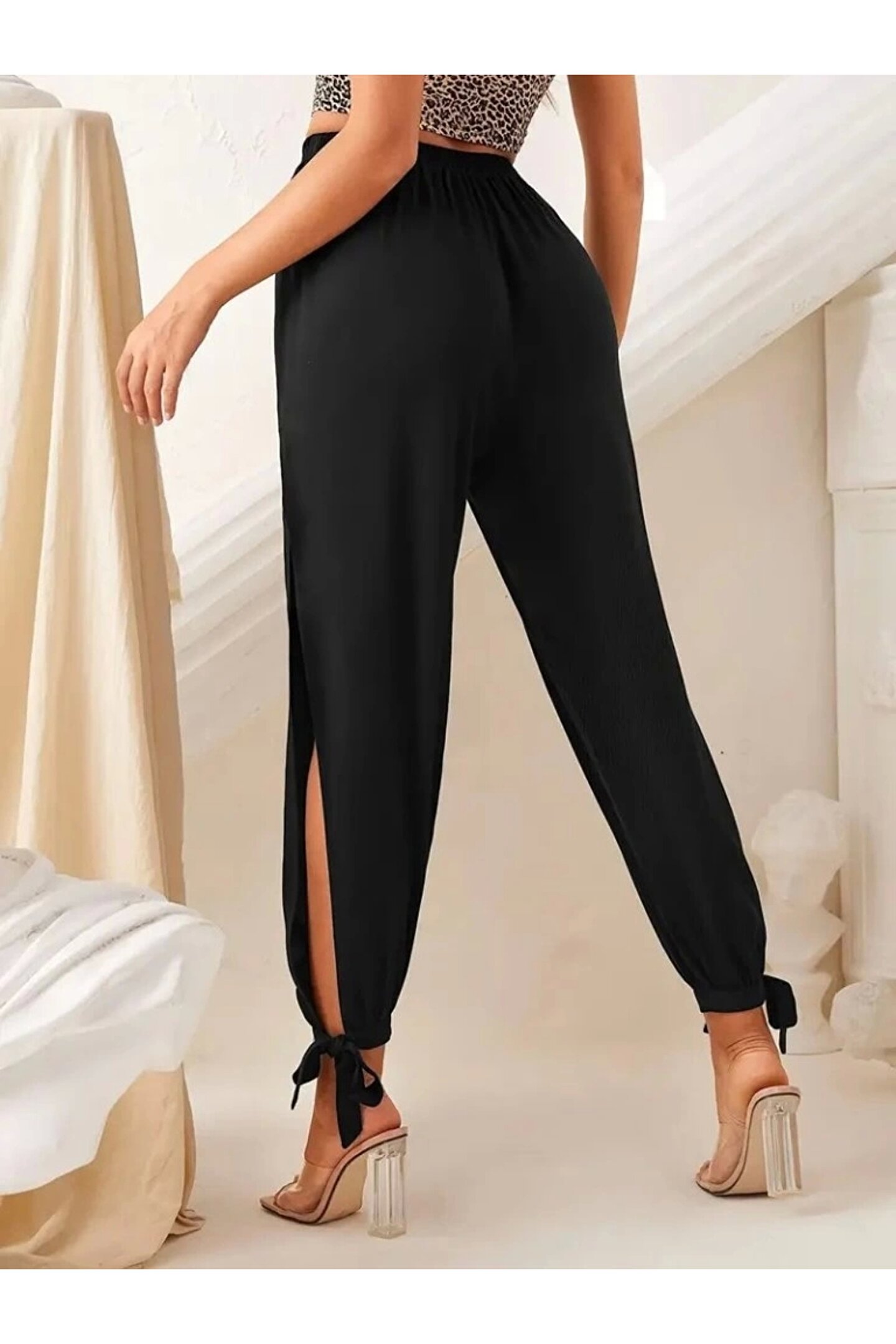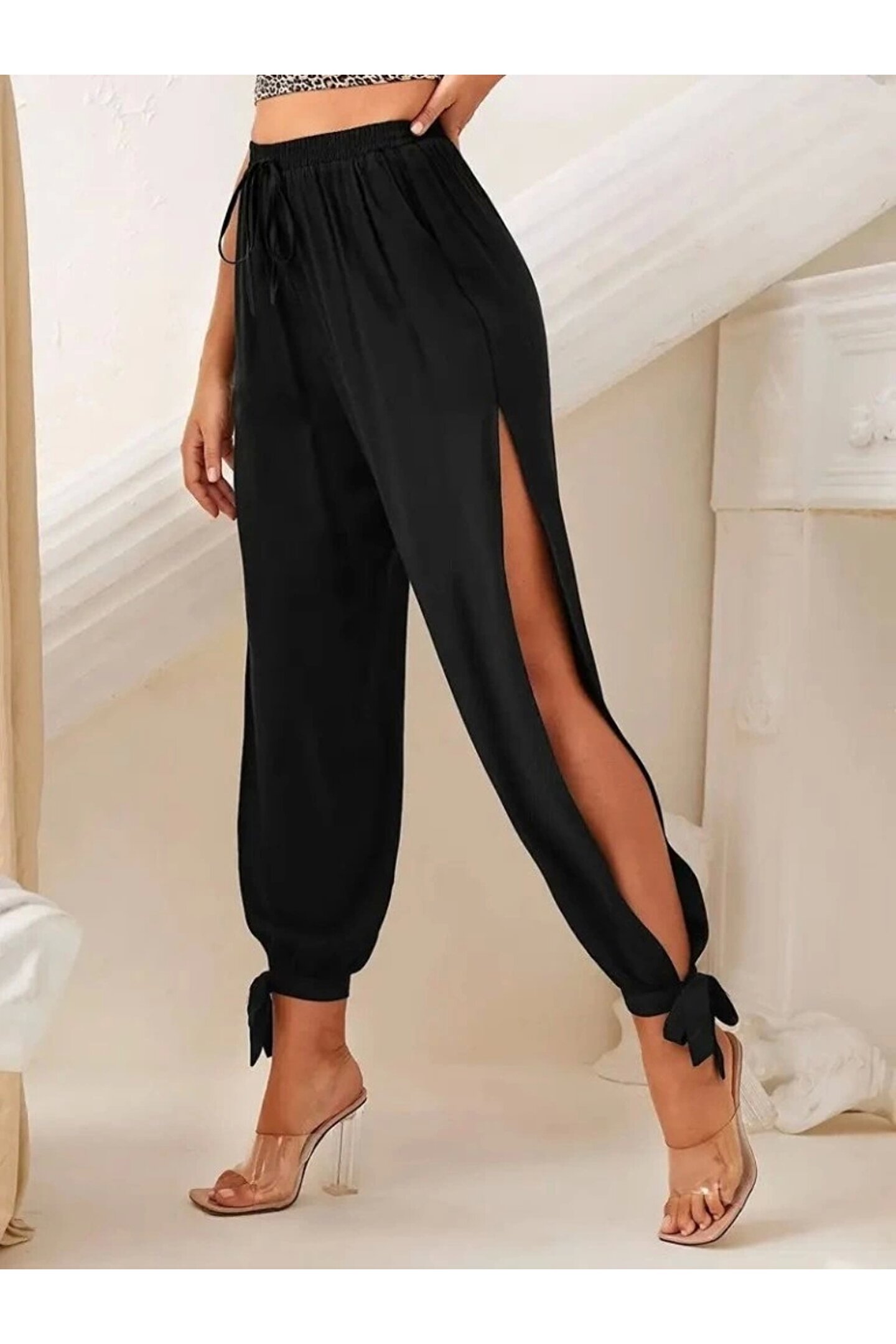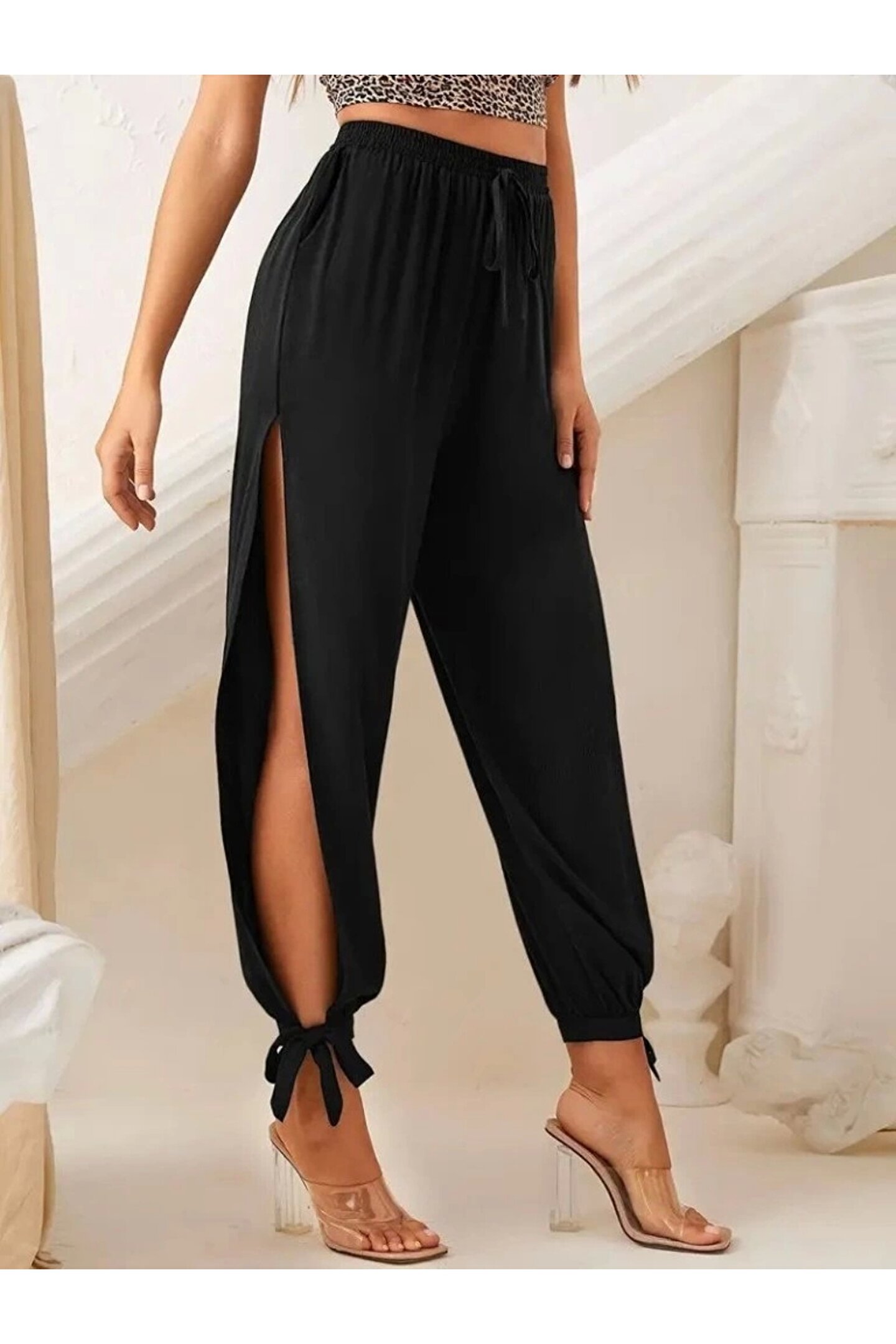 BETÜŞ WEAR Kadın Beli Lastikli Bağcıklı Yanları Yırtmaç Detaylı Bilekten Bağcıklı Viskon Pantolon