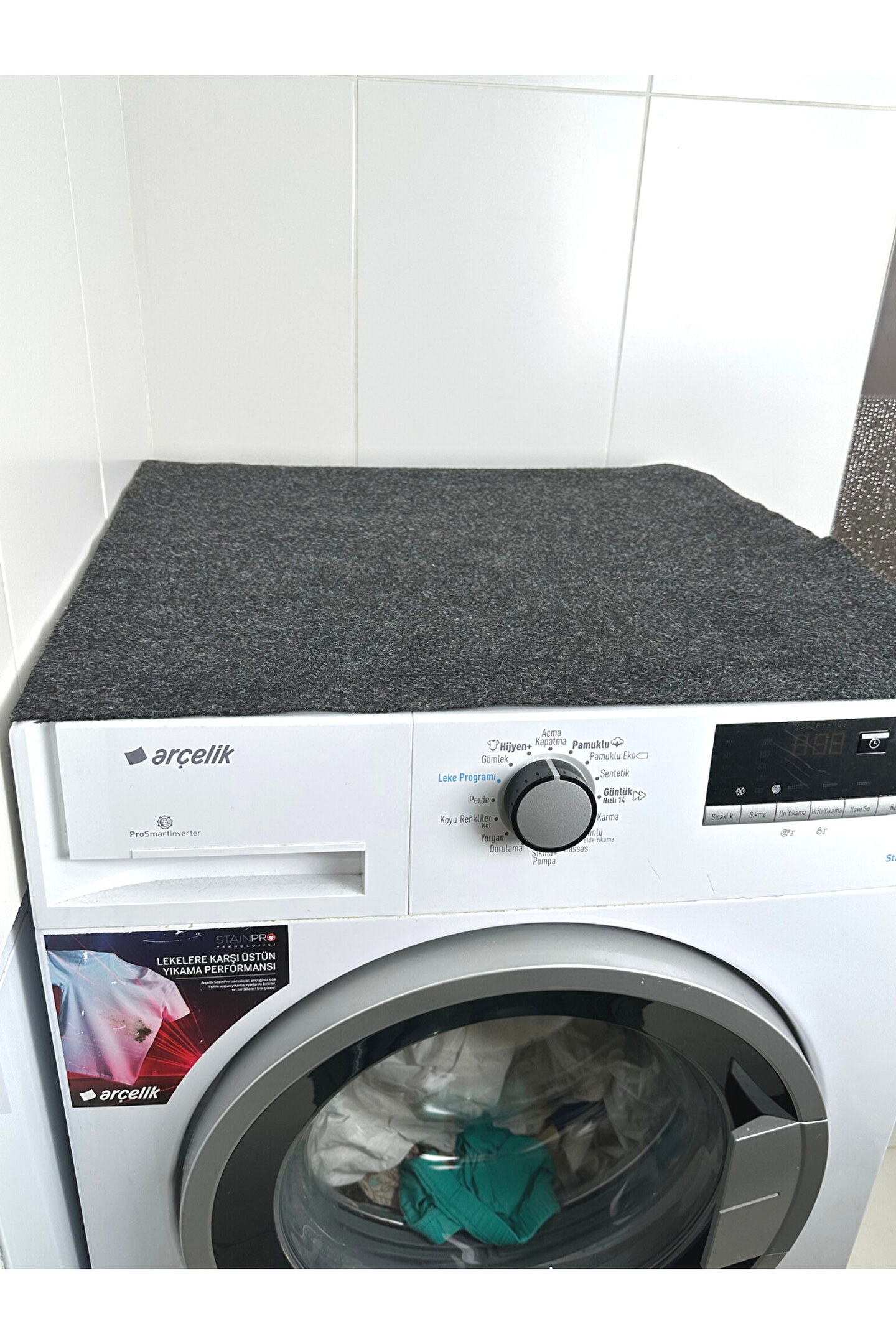 - Yüksek kaliteli polyester malzemeden üretilmiş, uzun ömürlü kullanım sunar.; - Kaymaz taban özelliği sayesinde çamaşır makinesinin kaymasını önler ve güvenli bir kullanım sağlar.; - Sıvı geçirmez yapıdadır, temizliği kolaydır.; - Antrasit rengiyle modern ve şık bir görünüm sunarken ev dekorasyonunuza uyum sağlar.; - Kolayca yıkanabilir olması pratiklik kazandırarak sık yıkama gerektiren alanlarda bile konforlu bir deneyim yaşatır.