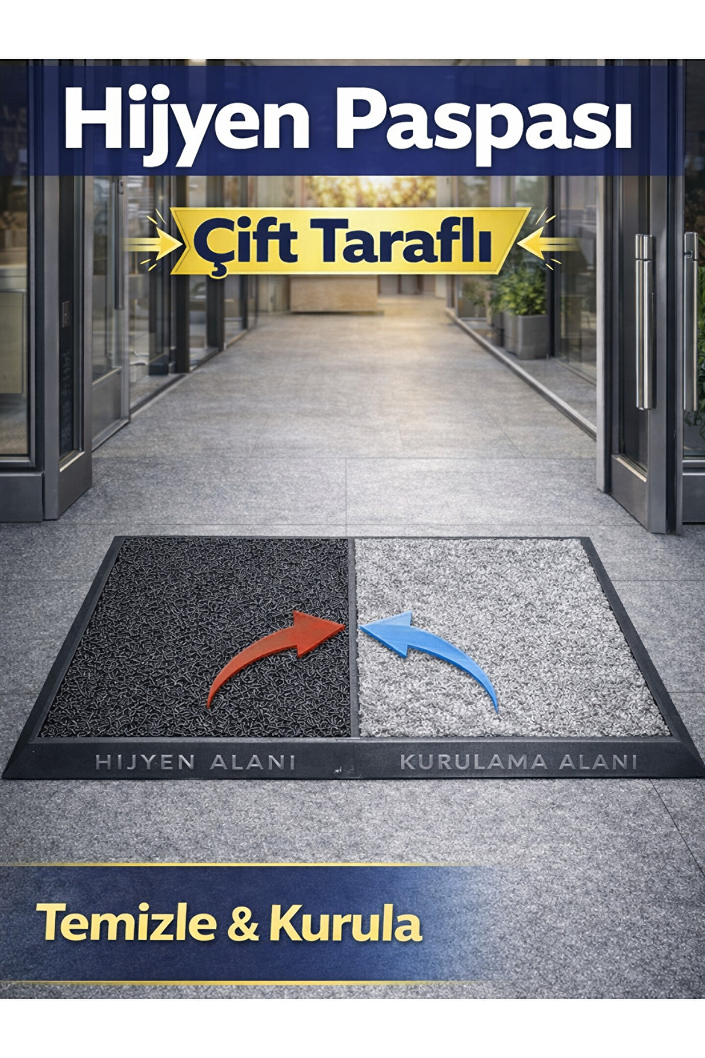 Çift Taraflı Hijyen Paspası, iç mekânlara girerken ayakkabı tabanındaki kir, toz ve nemi etkili şekilde temizlemek ve kurutmak amacıyla özel olarak tasarlanmıştır. İki farklı yüzeyden oluşan yapısı sayesinde tek üründe hem hijyen hem de kuruluk sağlar. Ev, okul, ofis, mağaza ve tüm işyeri girişleri için ideal bir çözümdür.