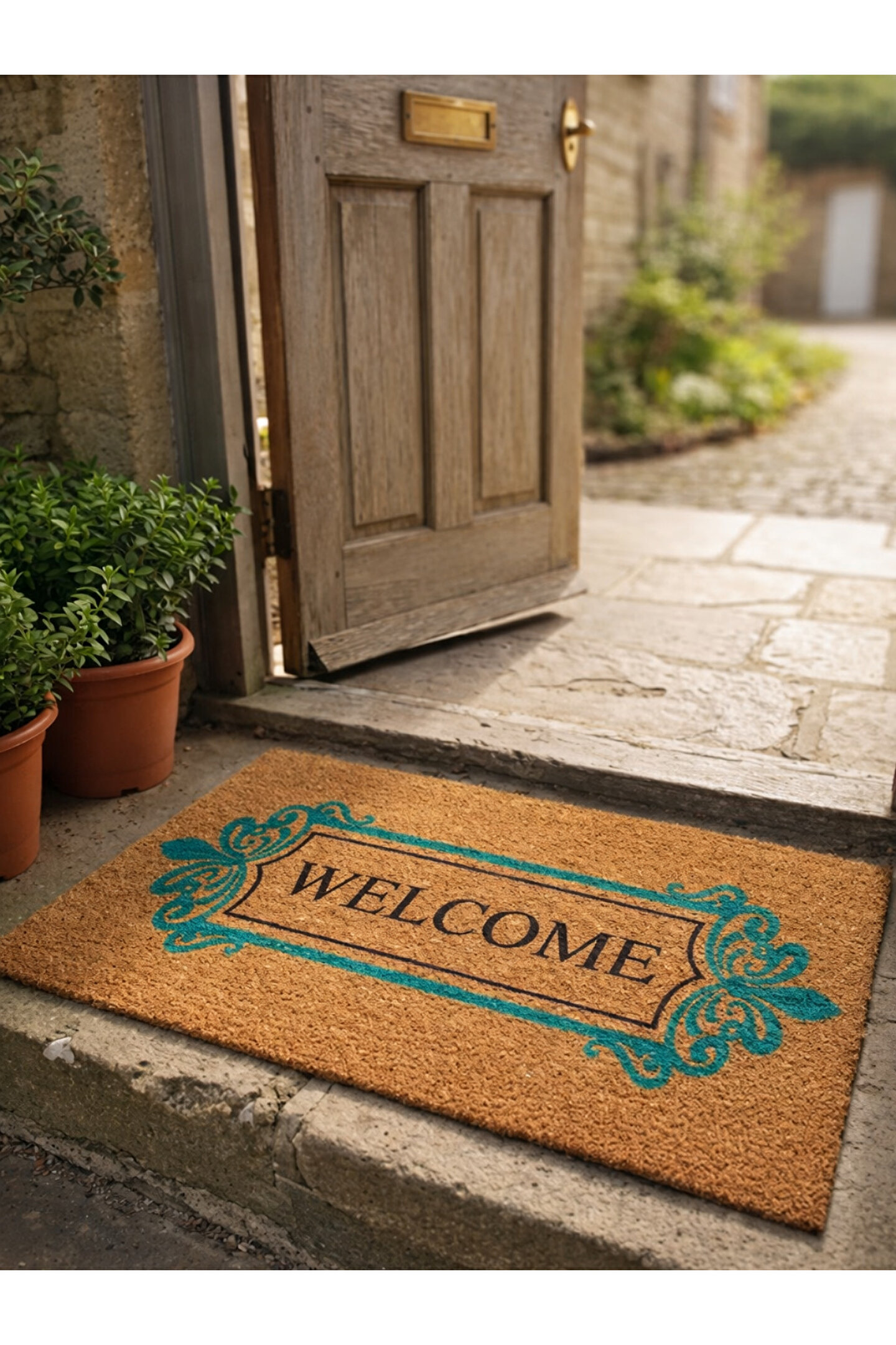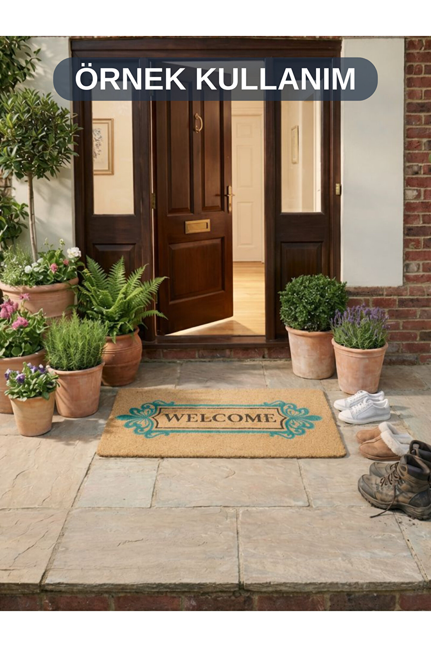 Özgün Tasarım ve Estetik Detaylar: Paspasın doğal lif dokulu kahverengi zemini, sıcak ve davetkar bir atmosfer yaratır. Bu doğal zemin üzerine işlenmiş, klasik motiflerden esinlenen turkuaz renkli zarif kenar süslemeleri, ürüne hem modern hem de otantik bir karakter kazandırır. Ortadaki dikey "WELCOME" yazısı, kontrast oluşturan siyah rengiyle net bir şekilde okunur ve şık bir odak noktası oluşturur. Renklerin uyumu ve desenlerin zarafeti, minimalistten klasiğe kadar pek çok farklı dekorasyon tarzıyla mükemmel bir şekilde bütünleşir.