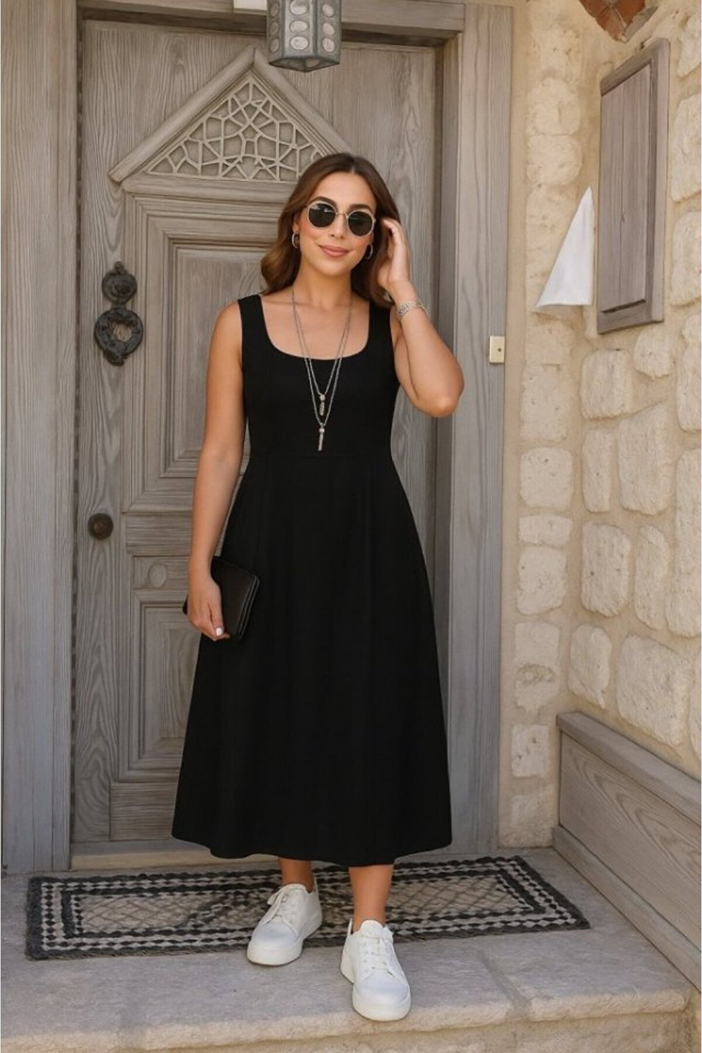 Kadın Askılı Geometrik Yakalı Geniş Kesim Detaylı Ithal Krep Elbise