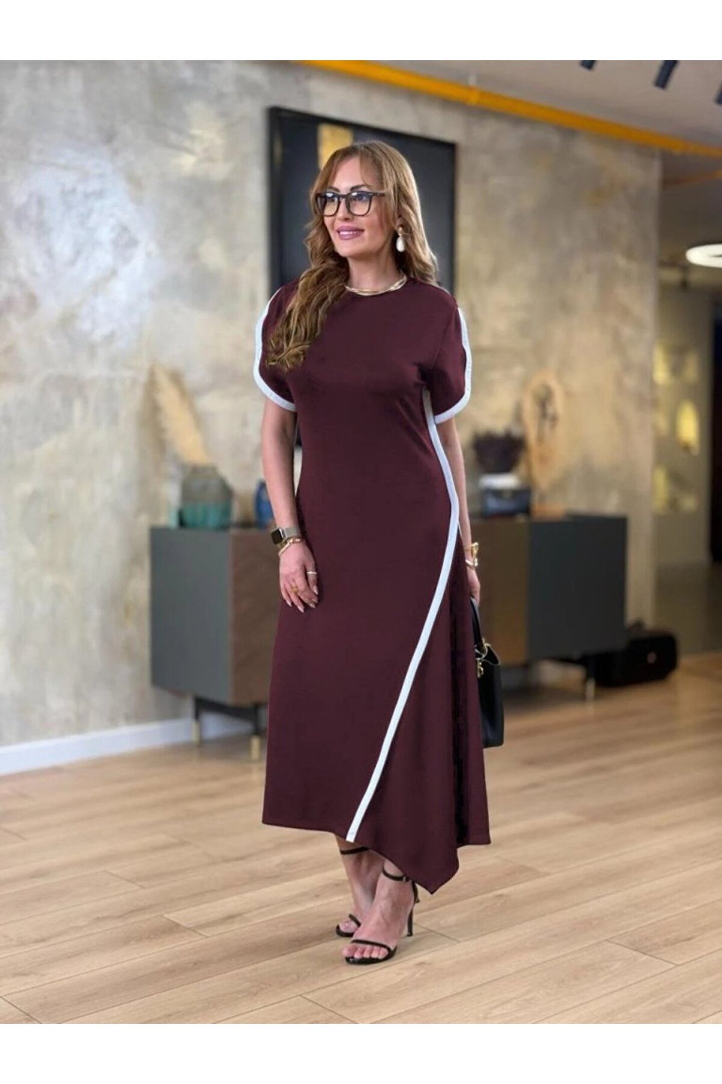 Kadın Kısa Kollu Bisiklet Yaka çift şerit Renk Detaylı Asimetrik Kesim Viskon Iki Iplik Elbise