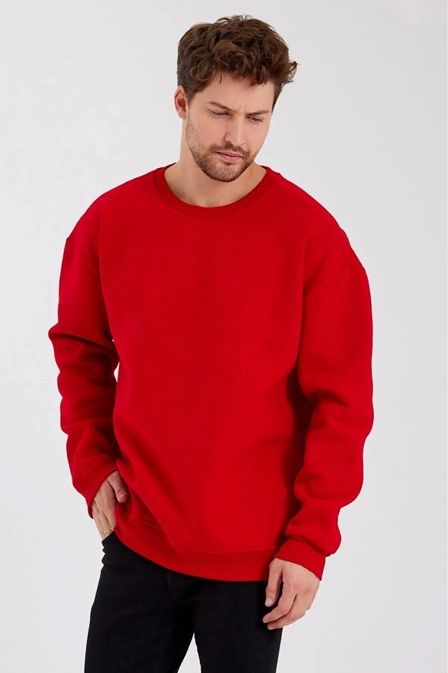 Erkek Düz Renk Bisiklet Yaka Sweat - Kırmızı