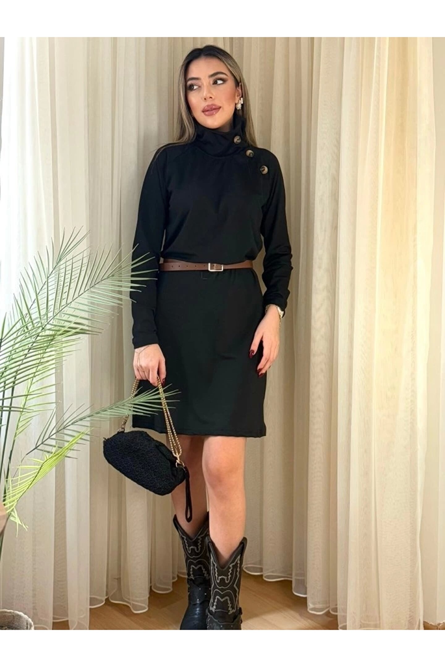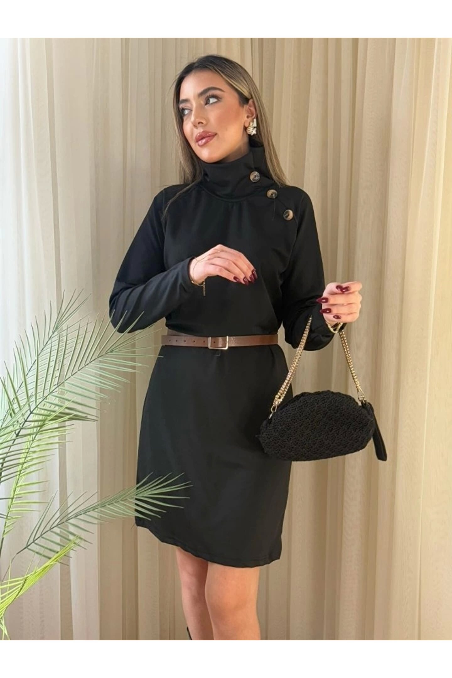 Bijuterria Kadın Uzun Kollu Balıkçı Yaka Düğme Detaylı Kısa şardonlu Dalgıç Elbise