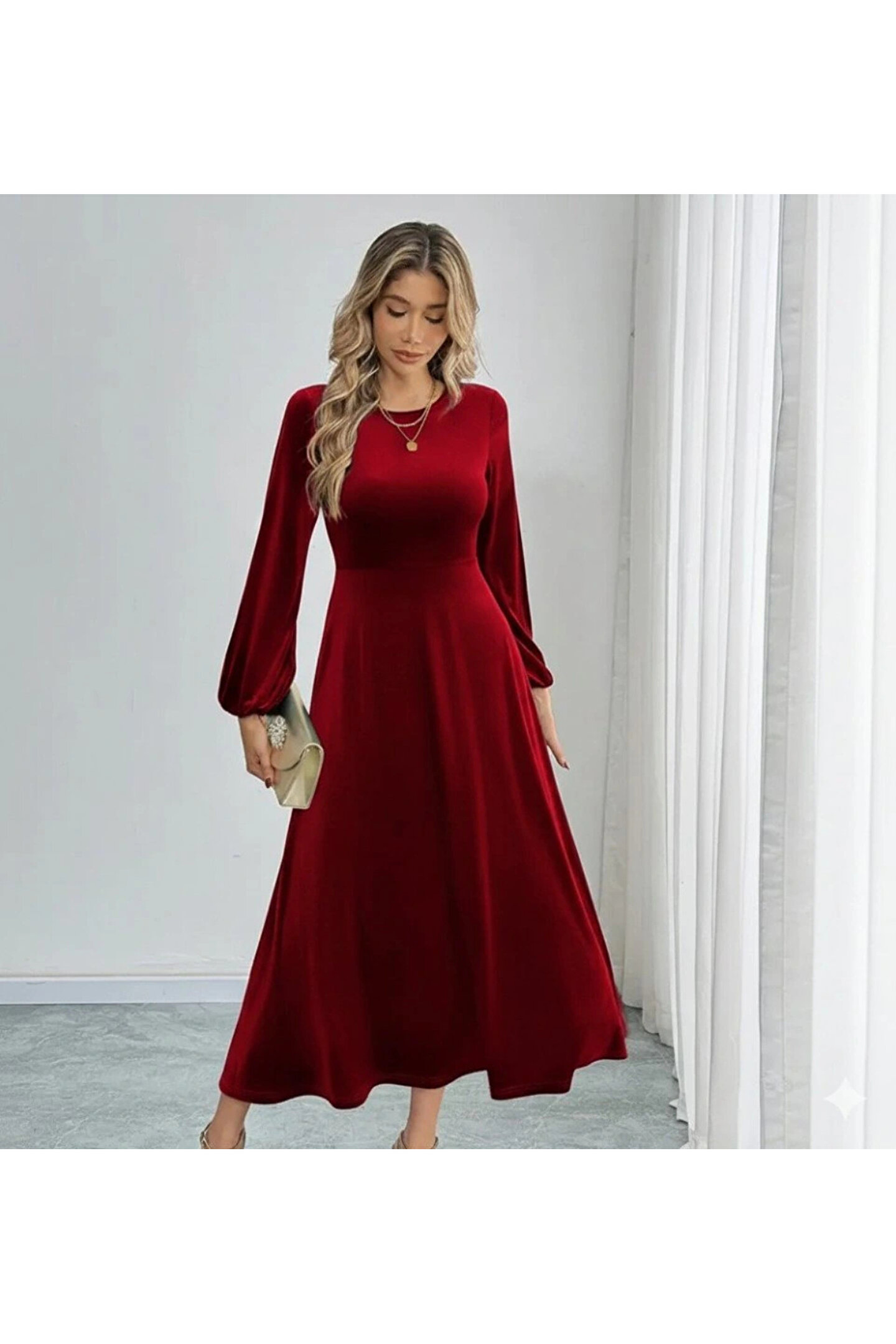 Kadın Uzun Kollu Bisiklet Yaka Midi Kadife Elbise