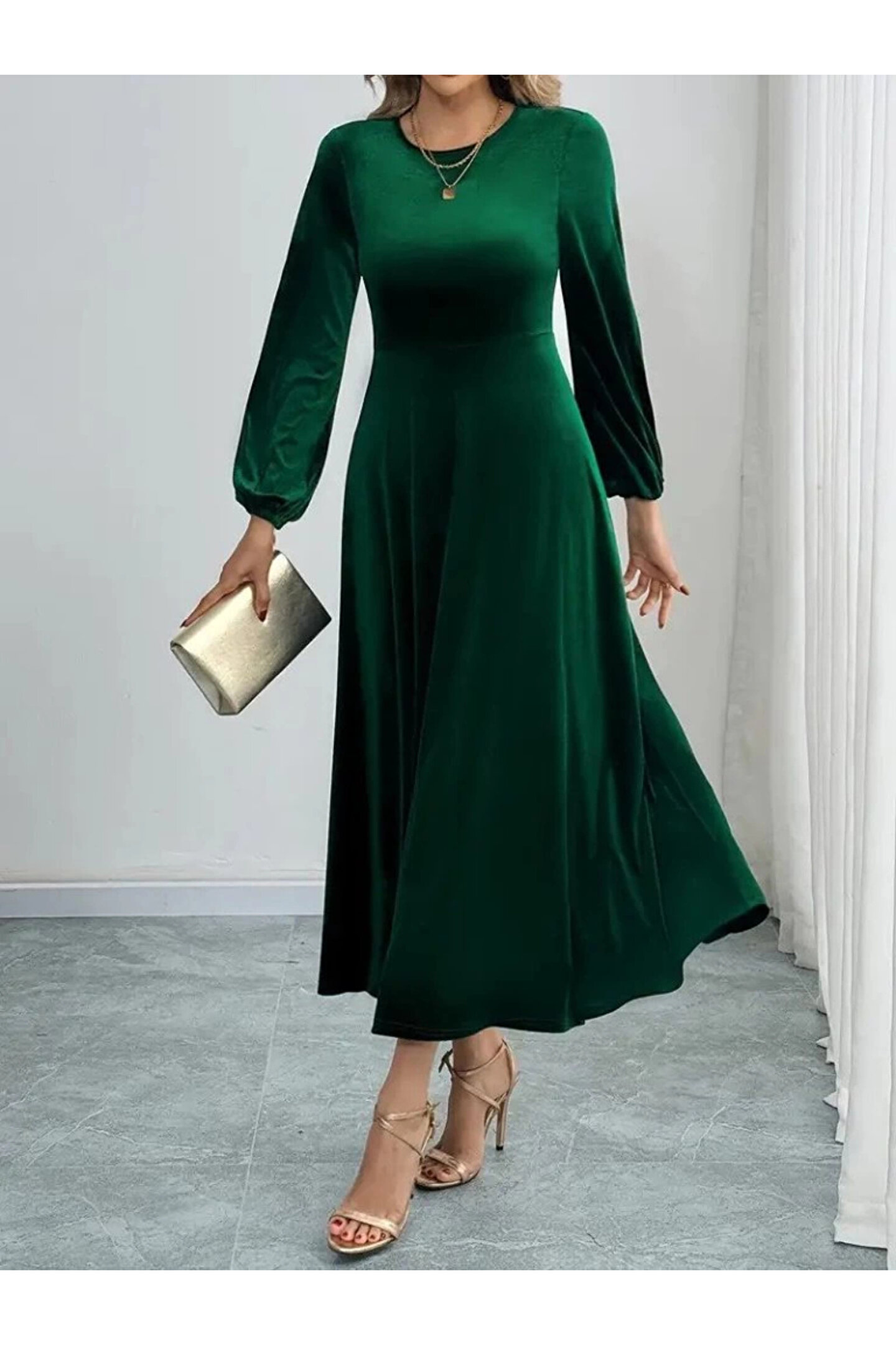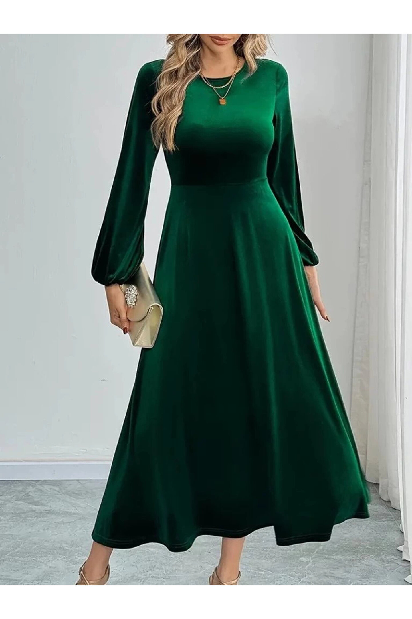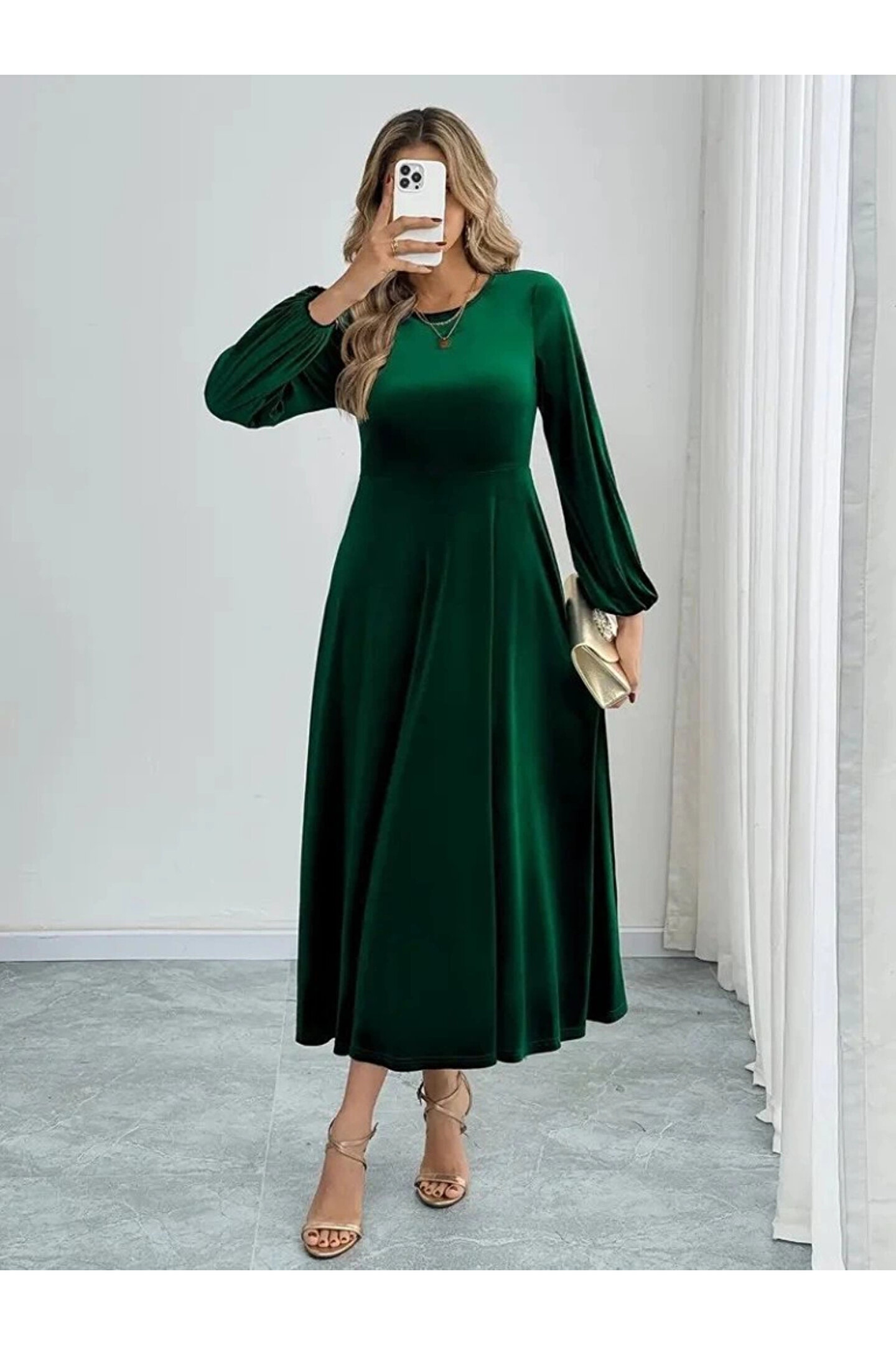 Kadın Uzun Kollu Bisiklet Yaka Midi Kadife Elbise