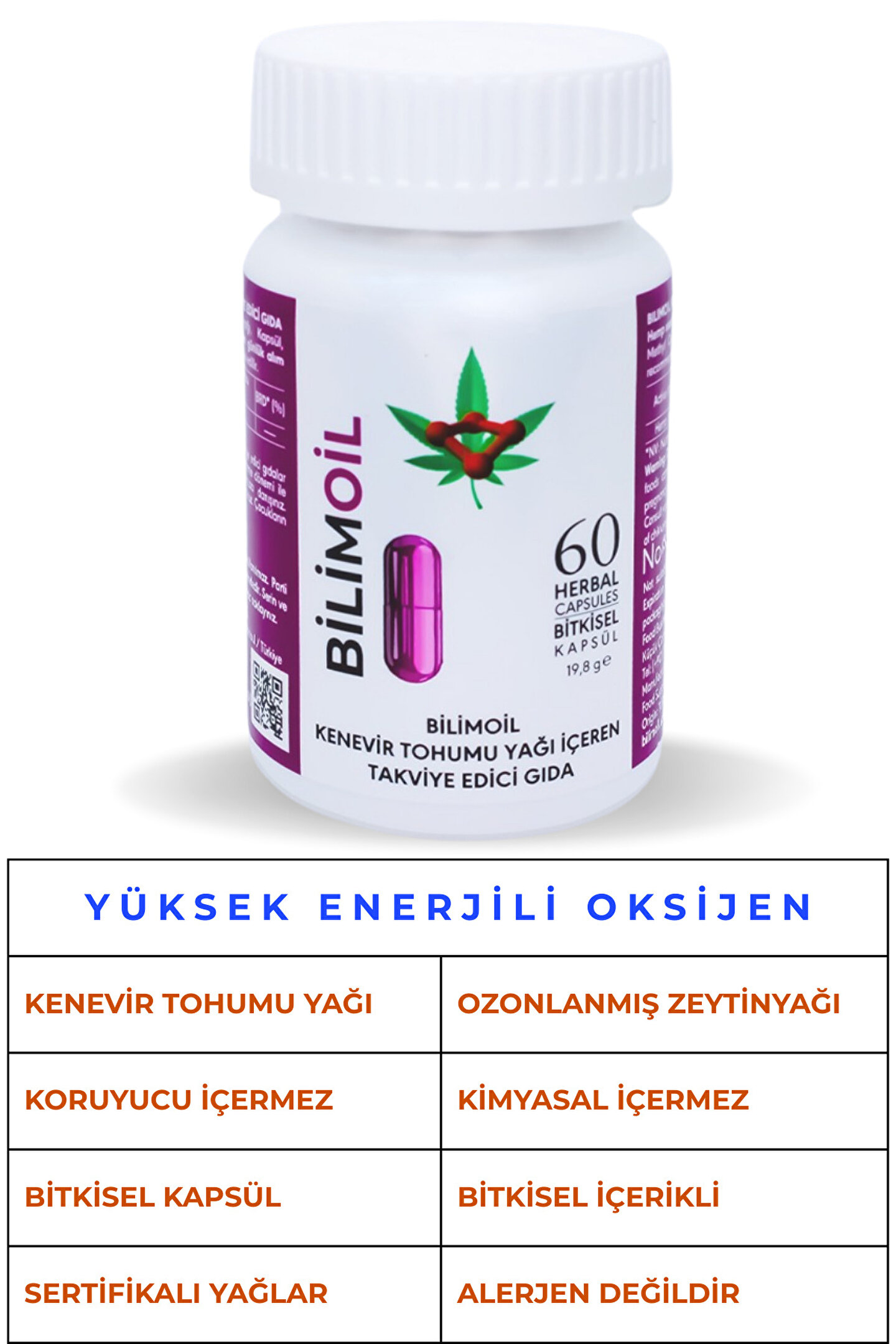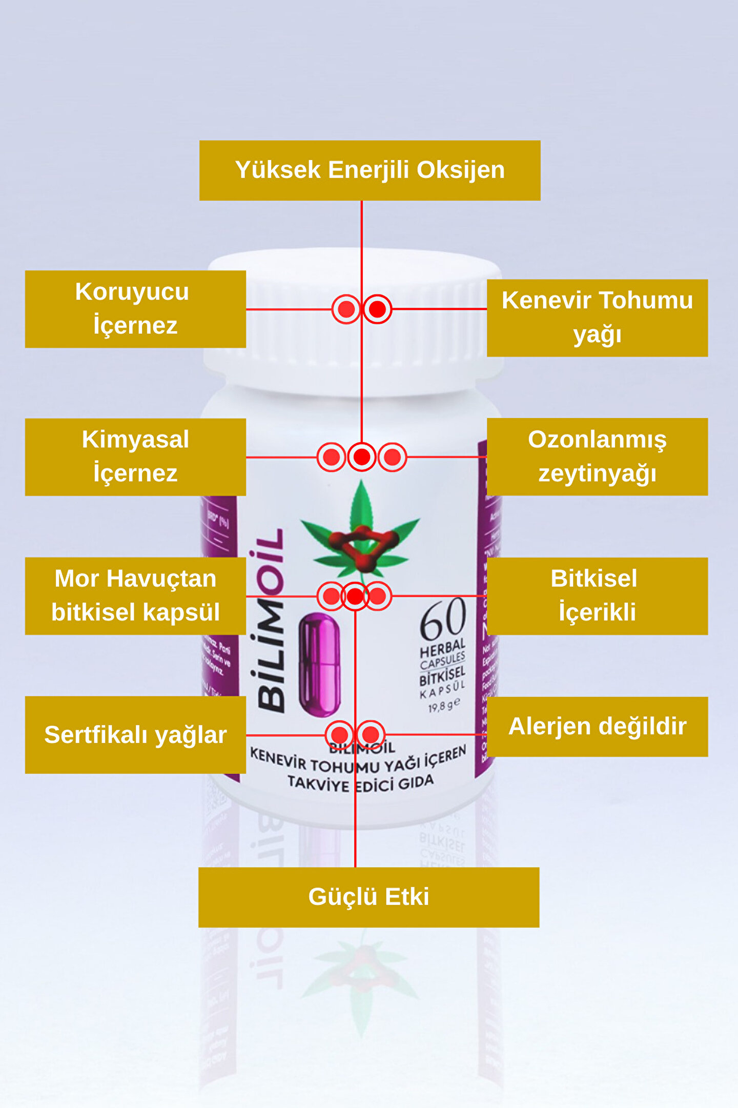 Yüksek enerjili oksijen ile zenginleştirilmiş, kenevir tohum yağı ve zeytinyağı içeren takviye edici gıda, kenevir tohumu yağı ve %100 ozonla zenginleştirilmiş soğuk sıkım zeytinyağından üretilmiştir.; İçeriğinde kimyasal ve koruyucu içermez.; Günlük kullanım miktarı 280 mg (2 adet)’dır.; Ürün düzenli kullanımda; vücudun antioksidan üretimini desteklemeye, metabolizmanın düzenlenmesine, bağışıklık sisteminin desteklenmesine, kanın oksijen taşıma kapasitesinin artmasına yardımcı olabilir.; Gıda takviyesinin kapsüllerinin üretilmesinde mor havuçtan elde edilen kapsüller kullanılmıştır.; Tamamen doğaldır.; Kullanım talimatlarına uygun olarak tavsiye edilen günlük porsiyonu aşmamak önemlidir; takviye edici gıdaların normal beslenmenin yerine geçemeyeceği unutulmamalıdır.; Hamilelik, emzirme dönemi veya hastalık durumlarında doktor tavsiyesi alınması gerekmektedir.; Ürünün saklanması için soğuk zincir koşullarında 4-20°C arası sıcaklıkta muhafaza edilmesi tavsiye edilir.; Çocukların ulaşamayacağı yerlerde saklanmalıdır.; Ürün 1 adet olarak gönderilecektir.
