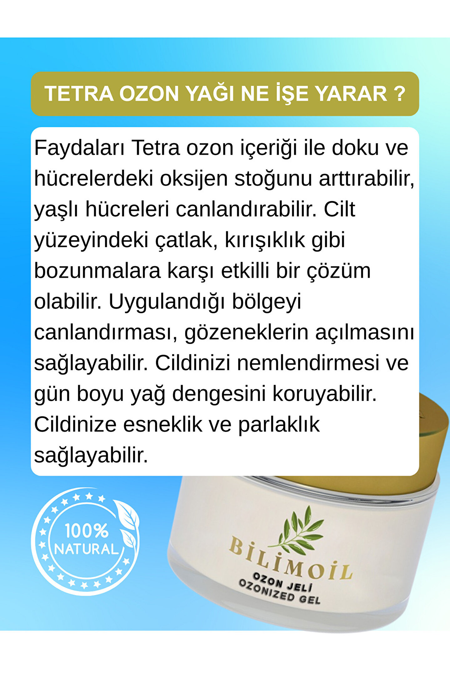 Oksijen ile zenginleştirilmiş zeytin yağından elde edilen ozon yağı cildin gözeneklerinin açılmasını ve antioksidan özelliği ile cildin temizlenmesini sağlayabilir. Cilt bakımı için ideal bir doğal üründür. %100 doğaldır. İçeriğinde Ozonized Olive Oil / Oksijenle Zenginleştirilmiş Zeytinyağı bulunur. Faydaları Tetra ozon içeriği ile doku ve hücrelerdeki oksijen stoğunu arttırabilir, yaşlı hücreleri canlandırabilir. Cilt yüzeyindeki çatlak, kırışıklık gibi bozunmalara karşı etkilli bir çözüm olabilir. Uygulandığı bölgeyi canlandırması, gözeneklerin açılmasını sağlayabilir. Cildinizi nemlendirmesi ve gün boyu yağ dengesini koruyabilir. Cildinize esneklik ve parlaklık sağlayabilir. Herhangi bir katkı maddesi içermez.Natural sabunla veya ozonlu sabun ile cildinizi temizleyiniz. Temizlenmiş ve kuru cildinize jeli dairesel hareketlerle masaj yaparak uygulayınız.