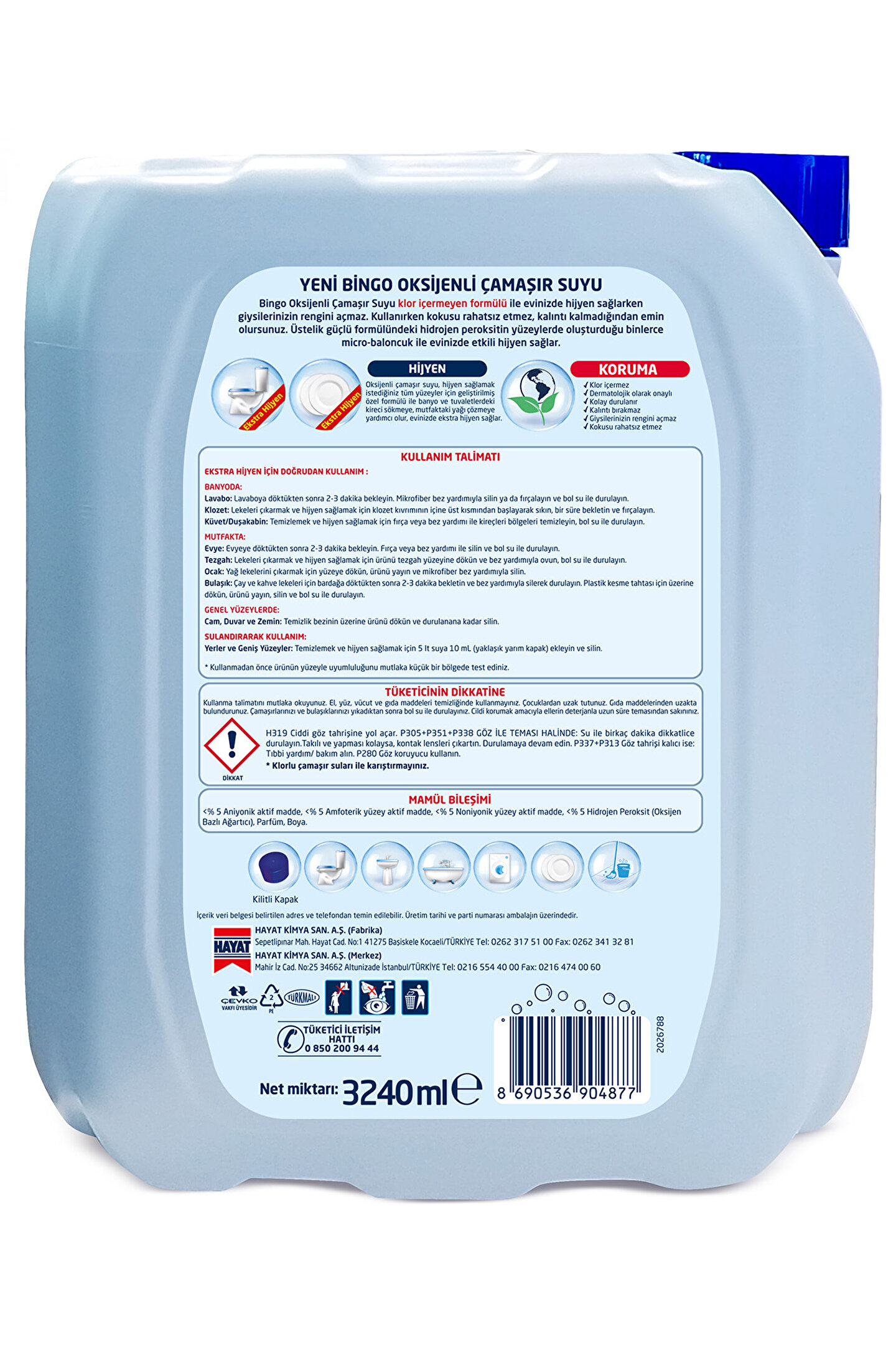 Bingo Oksijenli Çamaşır Suyu klor içermeyen formülü ile evinizde hijyen sağlarken giysilerinizin rengini açmaz.; Kullanırken kokusu rahatsız etmez, kalıntı kalmadığından emin olursunuz.; Üstelik, güçlü formülündeki hidrojen peroksitin yüzeylerde oluşturduğu binlerce, mikro-baloncuk ile evinizde etkili hijyen sağlar.