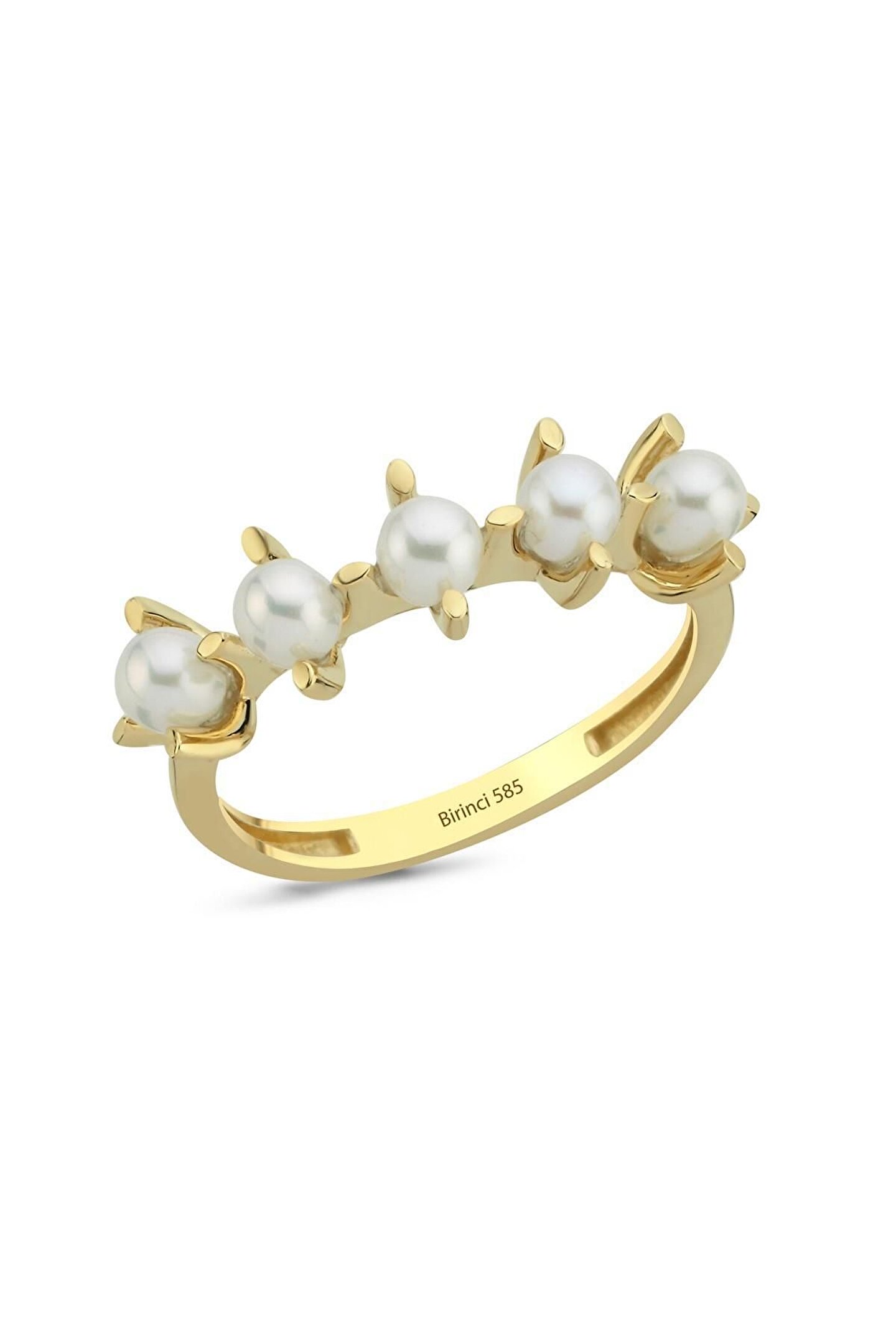 14 Ayar Altın 3 mm Badem Tırnak Beş Doğal İncili Yüzük
