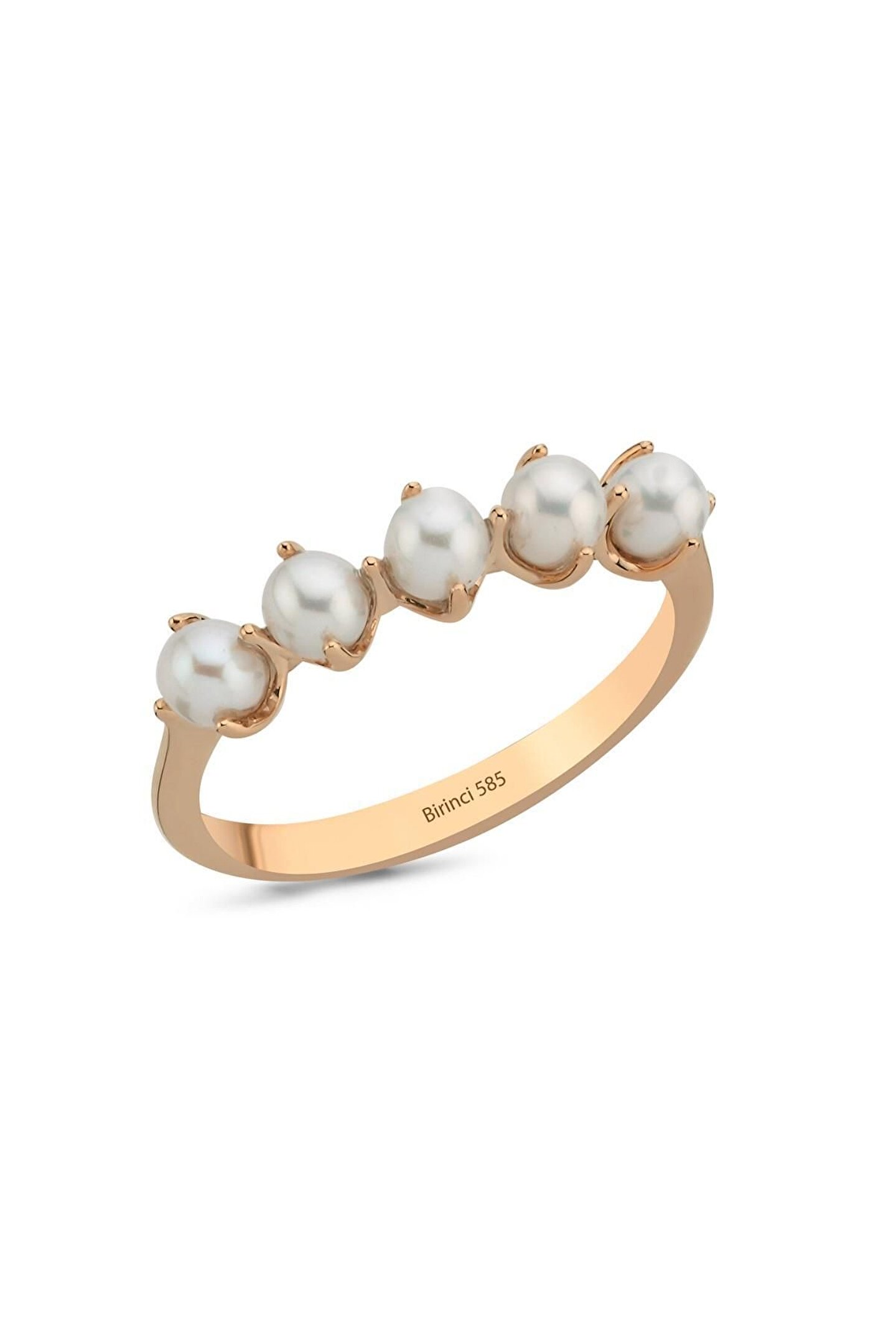 14 Ayar Altın 3 mm İnce Tırnak Beş Doğal İncili Yüzük