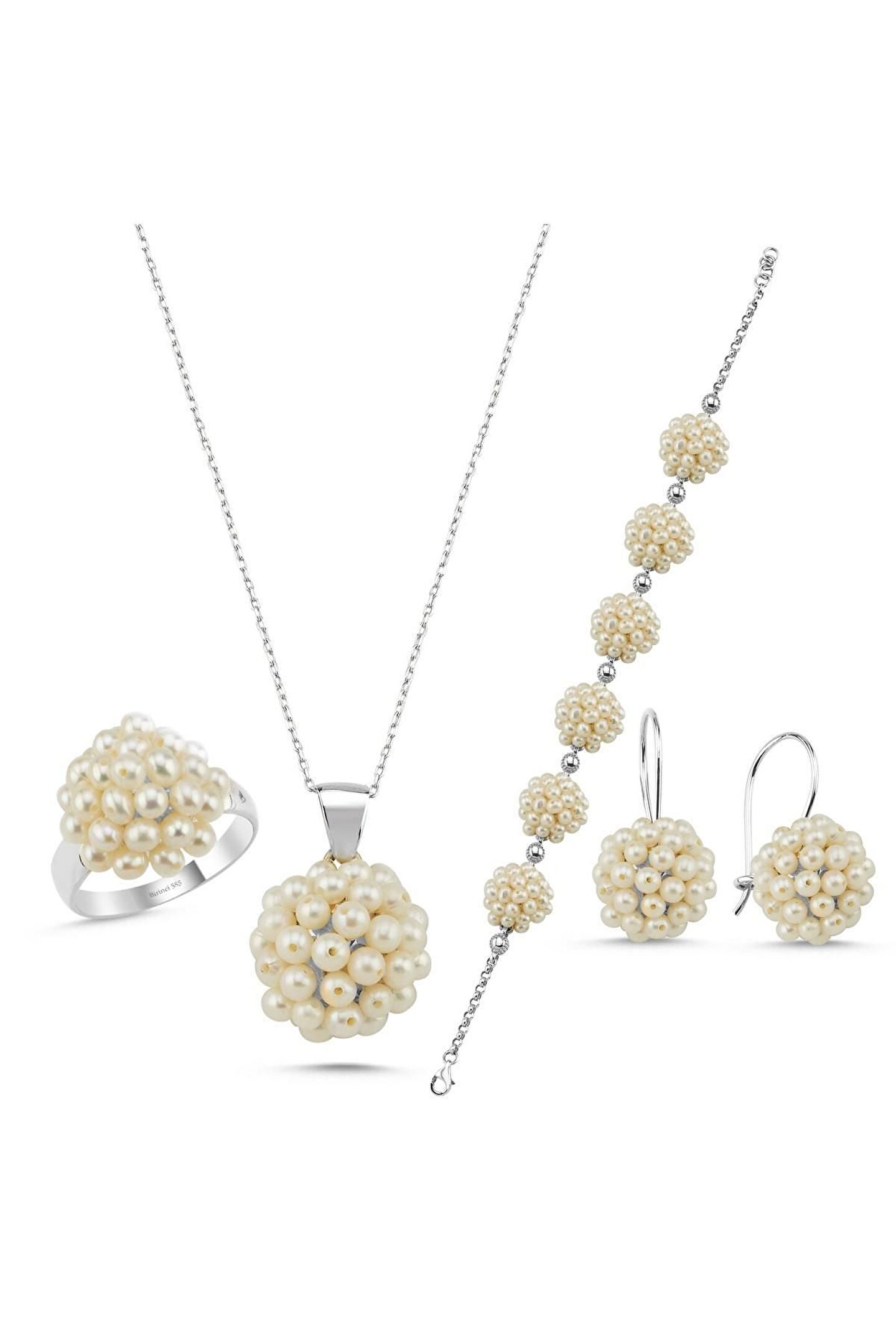 14 Ayar Altın 3 mm Prenses Model Doğal İnci Küpe Kolye Bileklik Yüzük Dörtlü Set